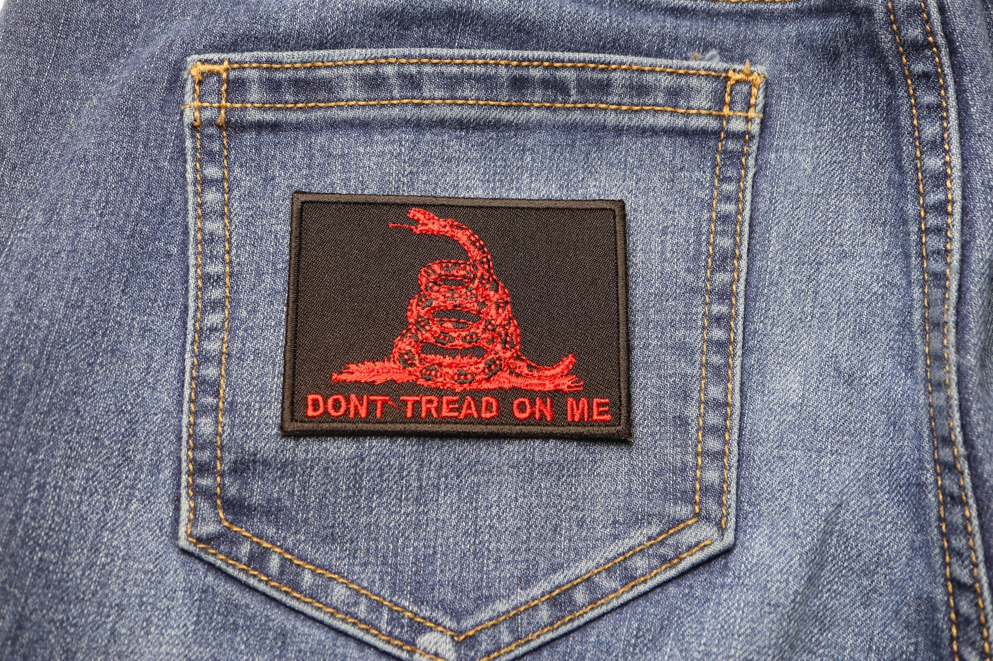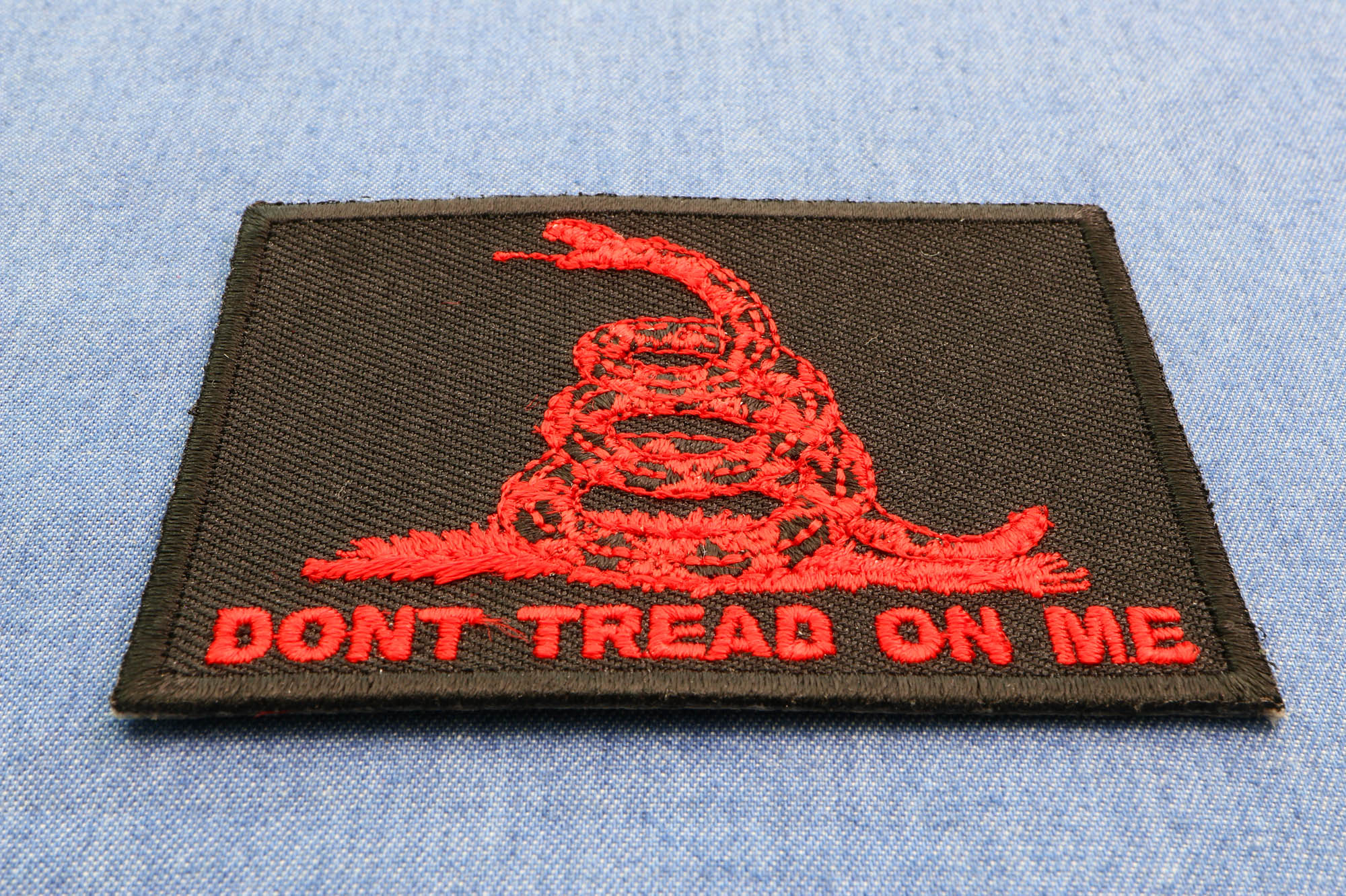 Don't Tread on Me Gadsden Flag Red over Black Patch is embroidered in Black / Red. Measures 3x2.25 inches. The patch can be sewn or ironed on. Do not iron on patches to leather or nylon material.