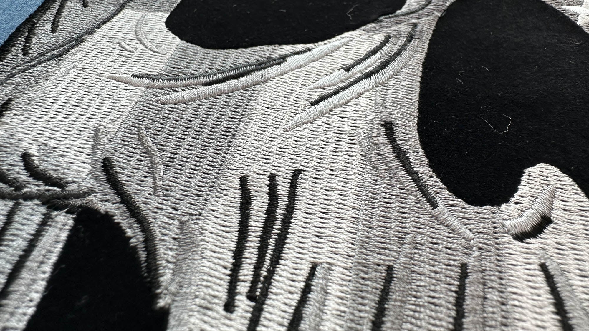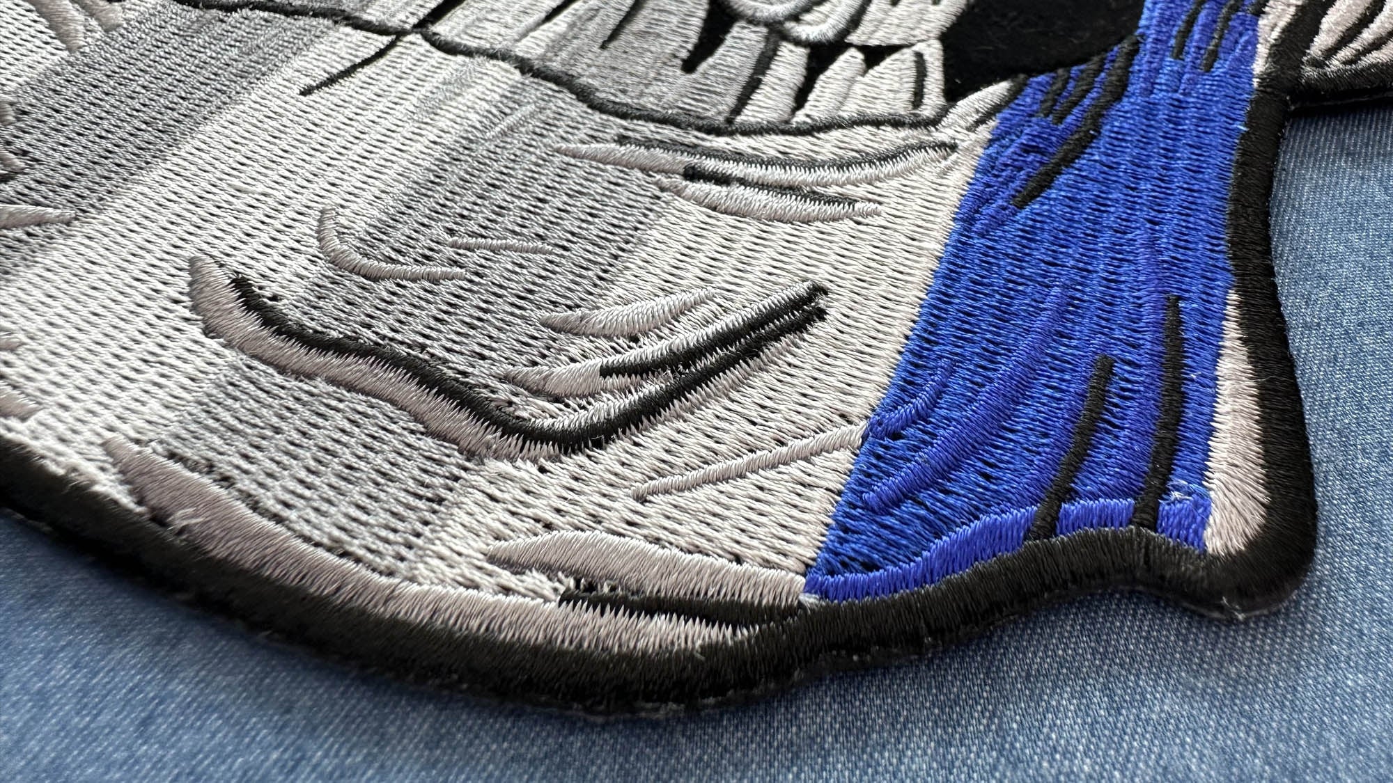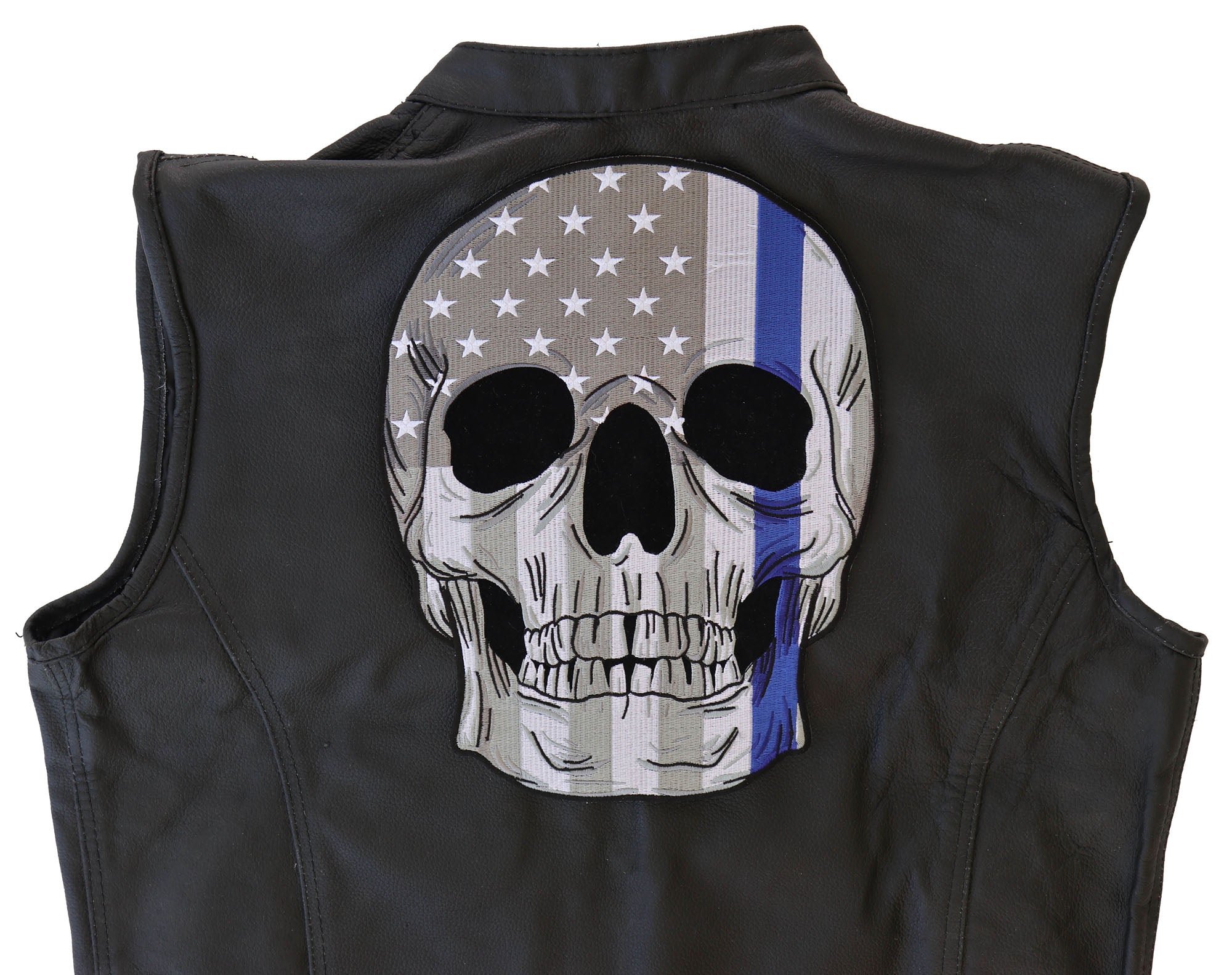 Police Skull US Flag with Blue Line Large Back Patch measures 9.25x12 inches and is Embroidered in Black / Gray / Blue. The Large Patch can be sewn on or ironed on to clothing such as Denim or Leather Jackets, Vests, Hats, Back Packs, Shirts. Features plastic backing and embroidered die cut borders.