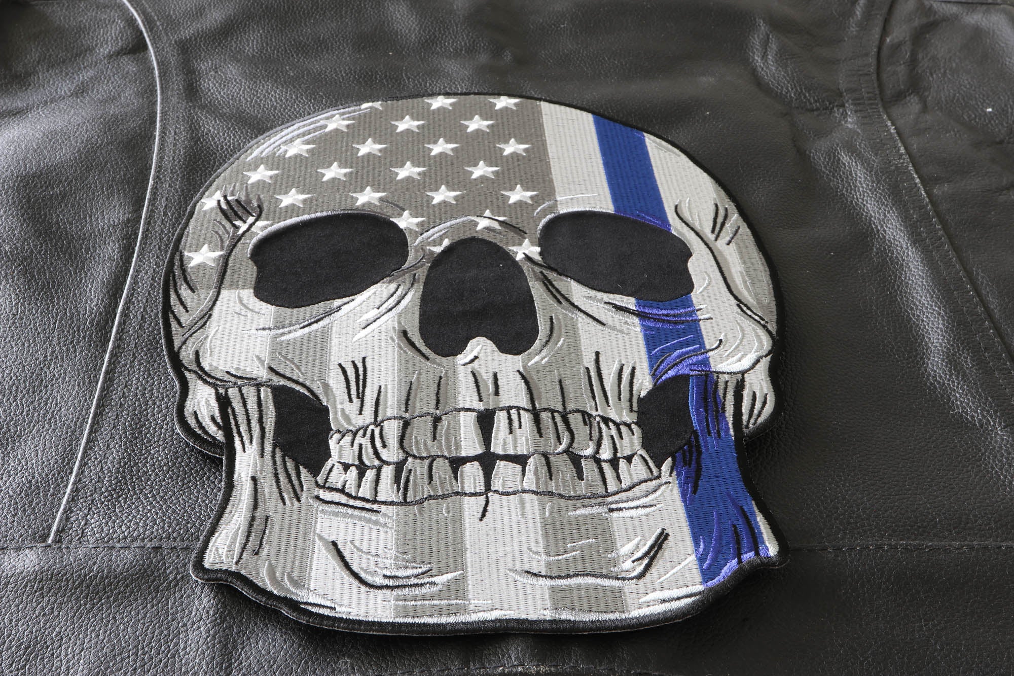 This skull features a gray toned American flag over it, one of the stripes running down is in blue. This is a popular patch among police officers. Blue is the color for Cops, Red is for firefighters. We made it in two different sizes, incase you are not looking for a large back patch version there is a smaller one measuring about 4 inches. It's at a perfect size to go almost anywhere on your leather. Copyright number VA0002104777
