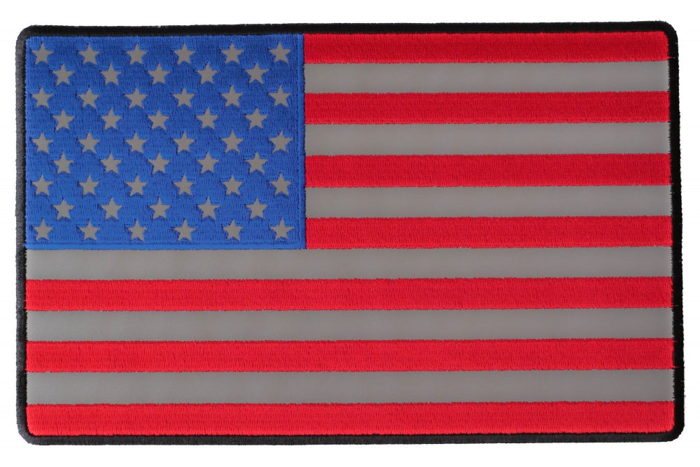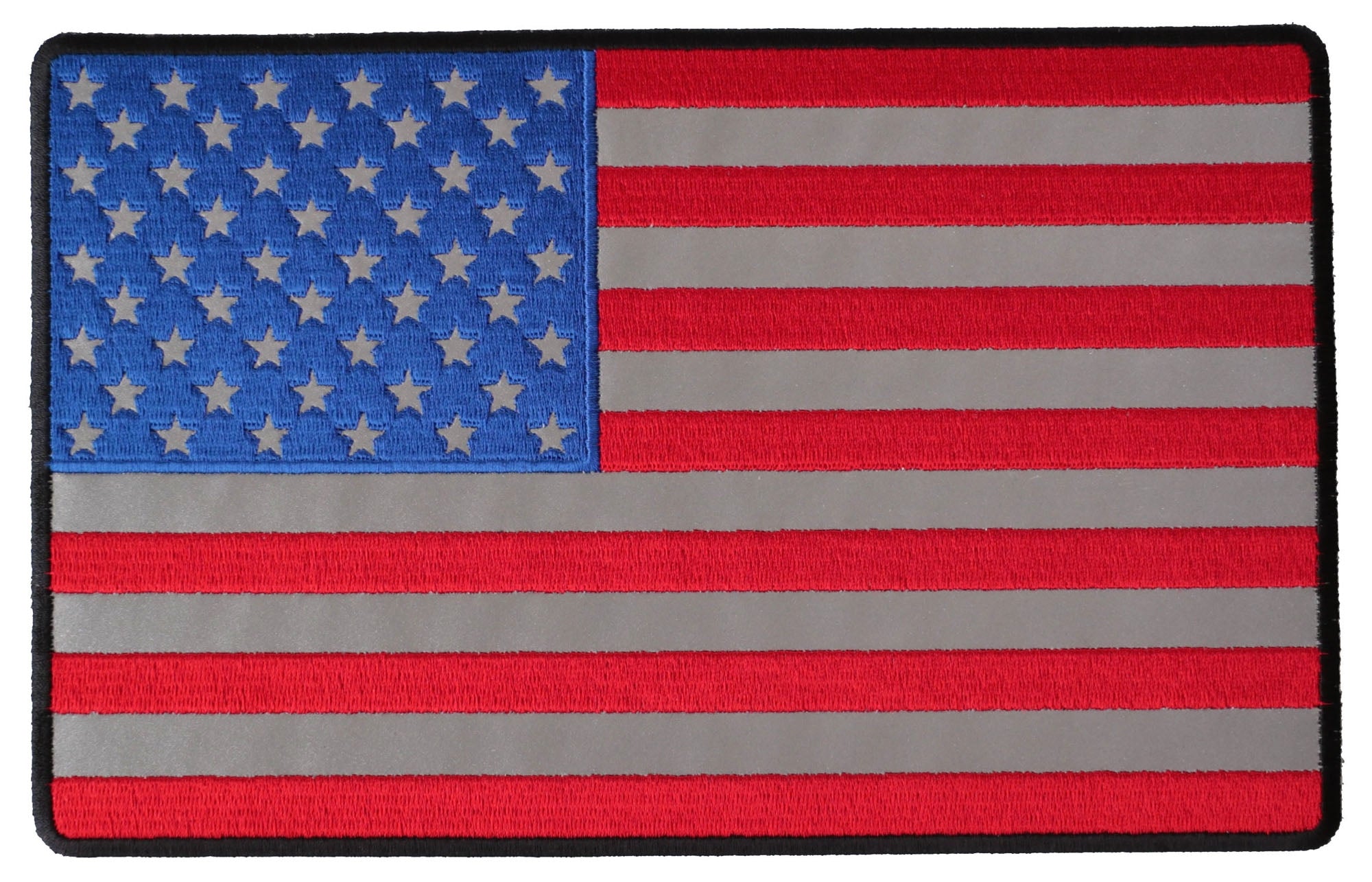 Large American Flag Iron on Patch and reflective at the same time. I've used reflective fabric and eliminated all the white off the flag leaving the stars and white stripes as reflective material. Show you patriotism and be seen at night all in one shot. Measures 10x6.25 inches. Has a black border running along the edge to you can sew it on as well. I did try to make the patch with reflective borders before as well, but the patch lost a lot of stiffness and the plastic iron on backing doesn't really like to stick on to reflective material. That's why a border was necessary to make sure the quality of the patch stands.