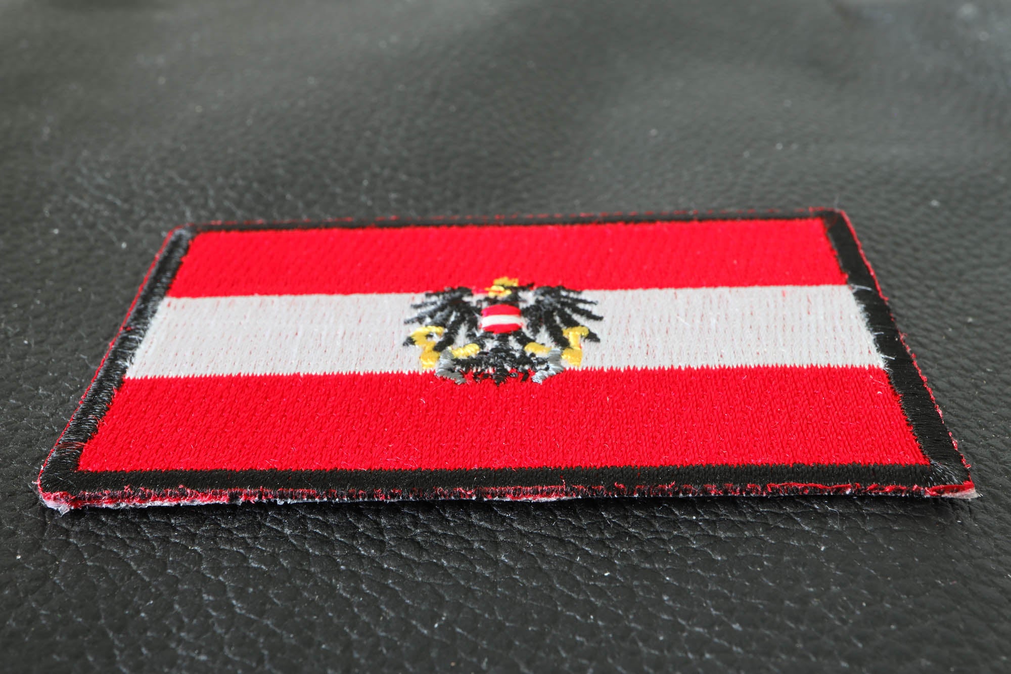 Austrian Flag Patch measures 3x2 inches and is Embroidered in Black / Red / White. The Small Patch can be sewn on or ironed on to clothing such as Denim or Leather Jackets, Vests, Hats, Back Packs, Shirts. Features plastic backing and embroidered die cut borders.