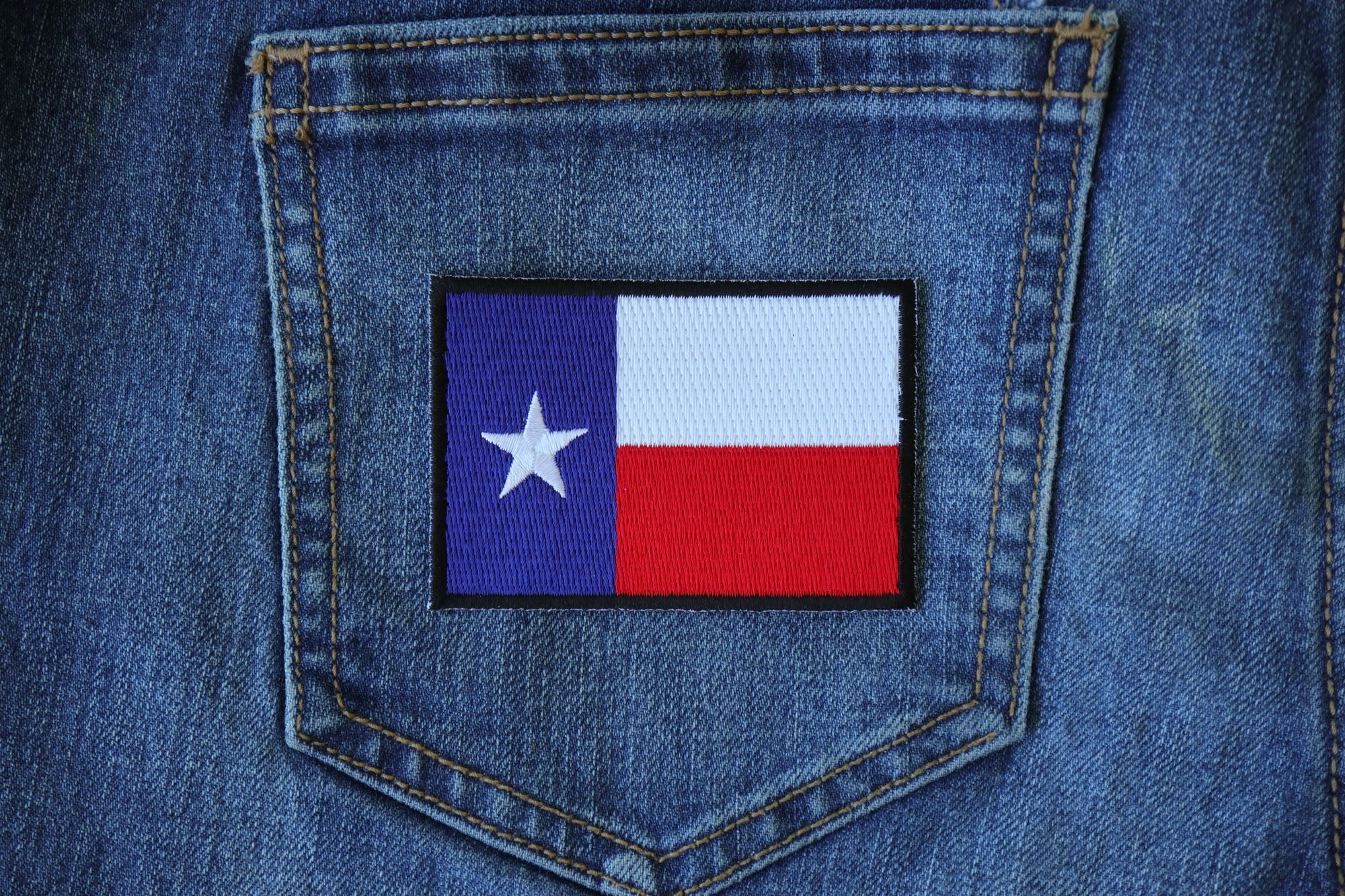 Black Border Texas Flag Patch measures 3x2 inches and is Embroidered in Red / White / Blue / Black. The Small can be sewn on or ironed on to clothing. The Black Border Texas Flag Patch features plastic iron on backing and clean laser cut embroidered borders.