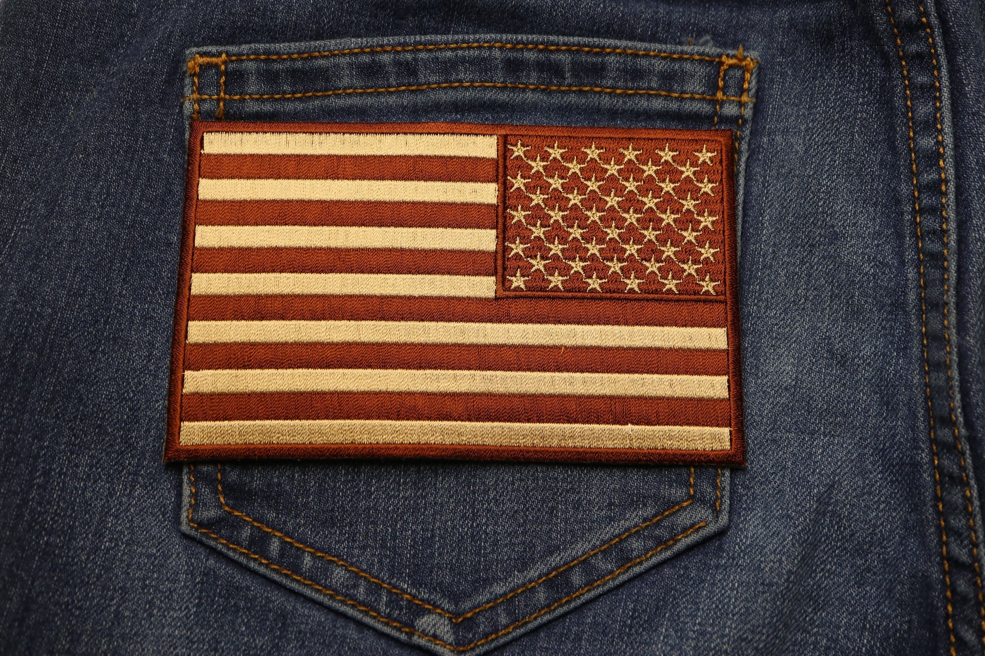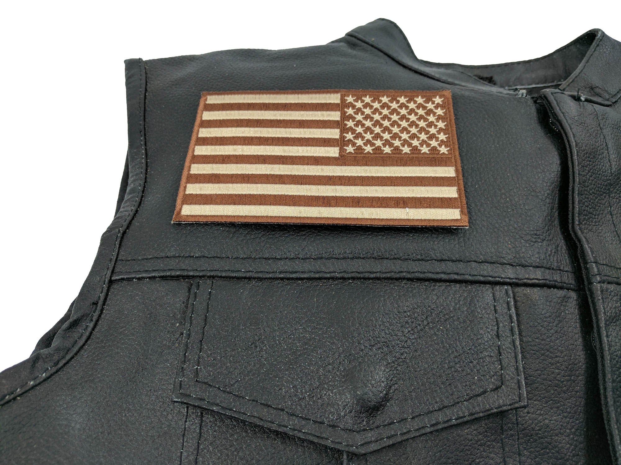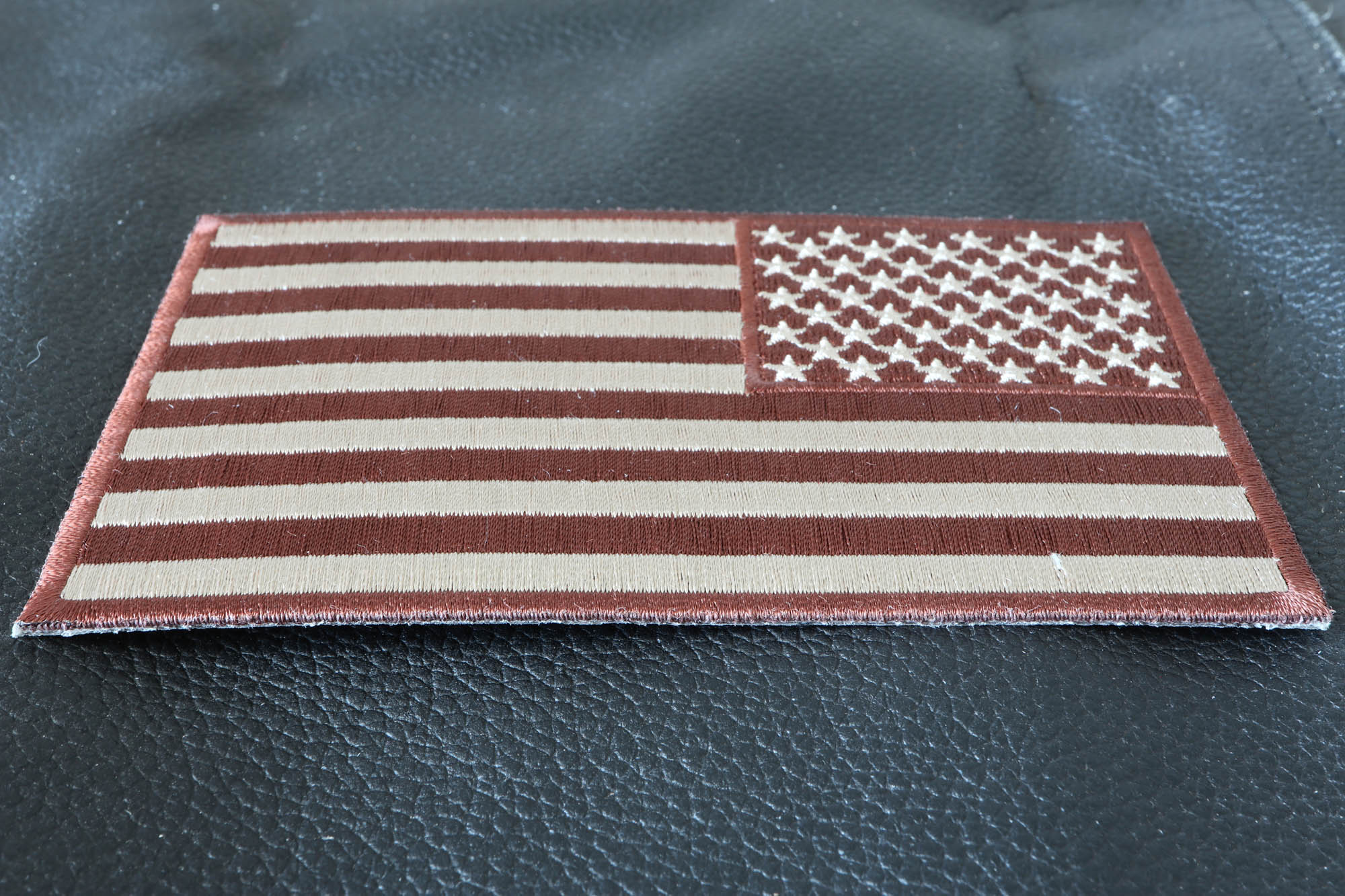 Brown Subdued American REVERSED Flag Patch measures 5x3 inches and is Embroidered in Brown. The Small Patch can be sewn on or ironed on to clothing such as Denim or Leather Jackets, Vests, Hats, Back Packs, Shirts. Features plastic backing and embroidered die cut borders.