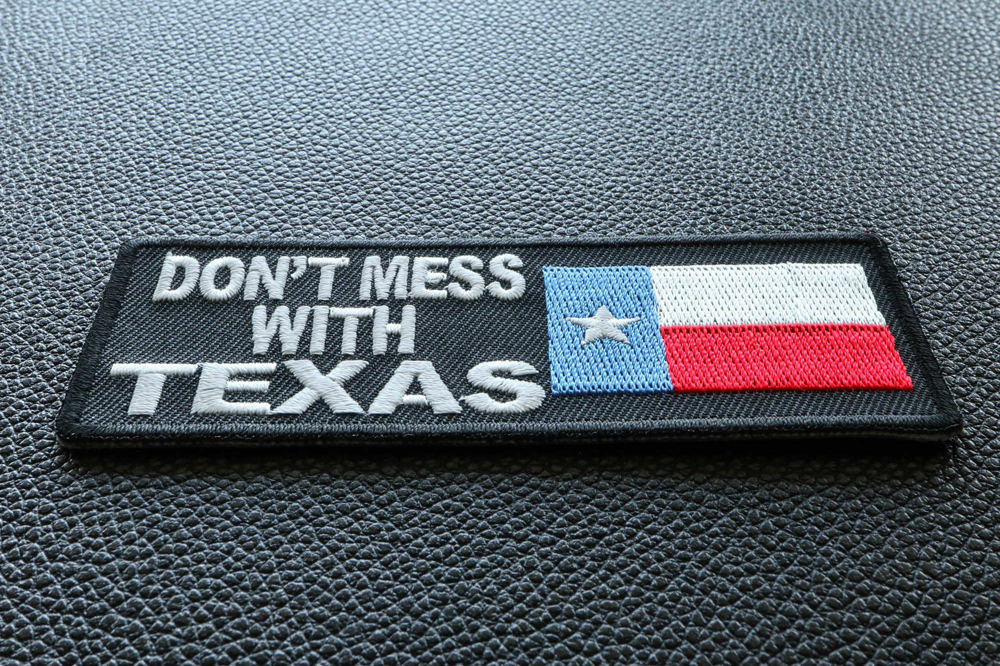 • Don't mess with Texas patch measures 4x1.5 inches. It is embroidered in white with the Texas flag in White Red and Blue next to it.