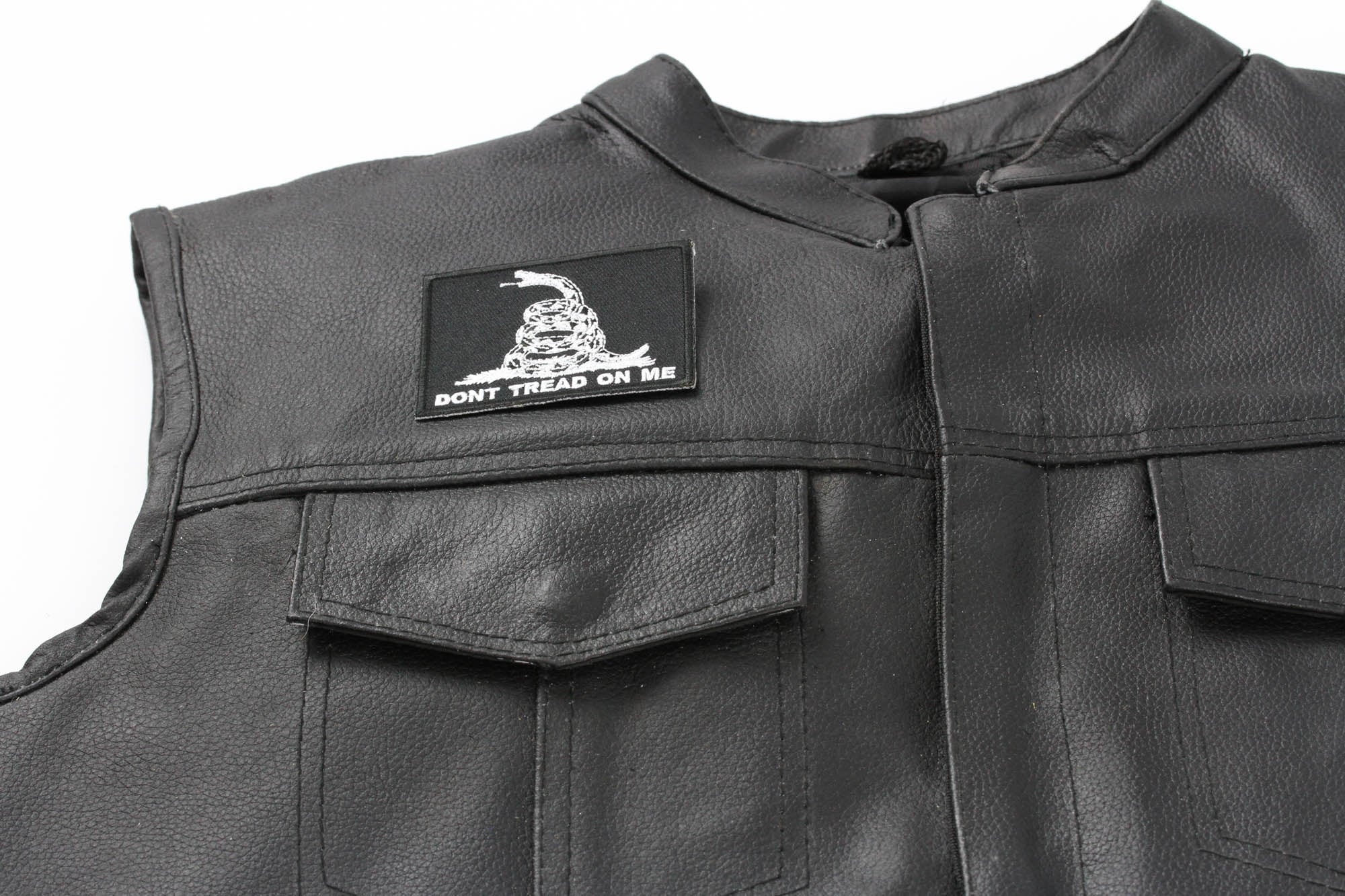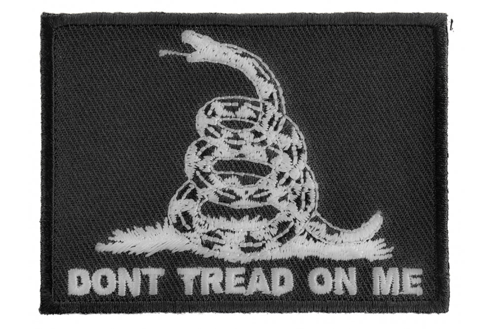 • This is a black and white version of the Don't Tread on Me Patch measuring 3x2 inches. Also known as the Gadsden flag. The original American flag. The tea party flag. We know some of you belong to clubs and cannot have the original colored version on your club vests so here it is in black and white. The meaning behind the flag is the coiled rattle snake will keep its defense and will strike if attacked upon, so Don't Tread on Me is the message to the enemy.