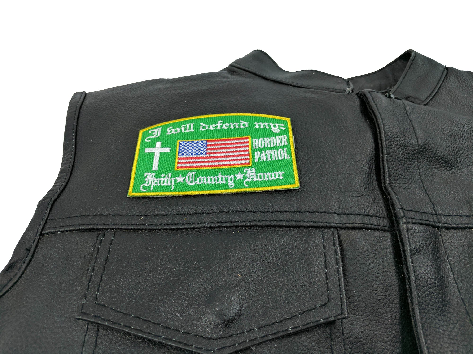 Will Defend Border Patrol Patch measures 4x2.6 inches and is Embroidered in Green / Yellow / Red / White / Blue. The Small Patch can be sewn on or ironed on to clothing such as Denim or Leather Jackets, Vests, Hats, Back Packs, Shirts. Features plastic backing and embroidered die cut borders.