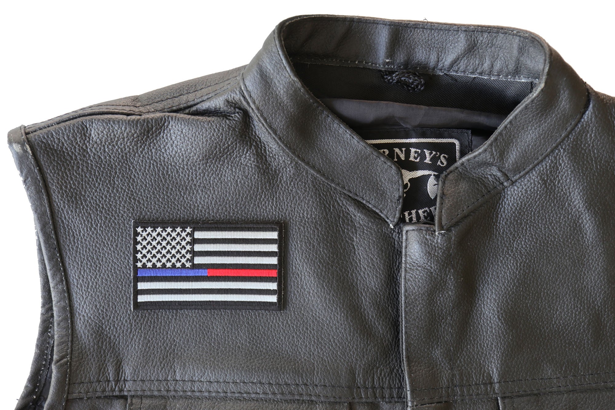 Law Enforcement and Firefighter Support American Flag Patch measures 3.5x2.1 inches and is Embroidered in Black / Gray / Blue / Red. The Small Patch can be sewn on or ironed on to clothing such as Denim or Leather Jackets, Vests, Hats, Back Packs, Shirts. Features plastic backing and embroidered die cut borders.