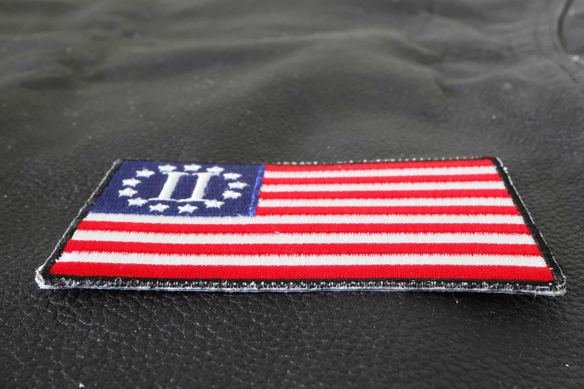 Second American Revolution Flag Patch measures 3.5x2.2 inches and is Embroidered in Red / White / Blue. The Small Patch can be sewn on or ironed on to clothing such as Denim or Leather Jackets, Vests, Hats, Back Packs, Shirts. Features plastic backing and embroidered die cut borders.