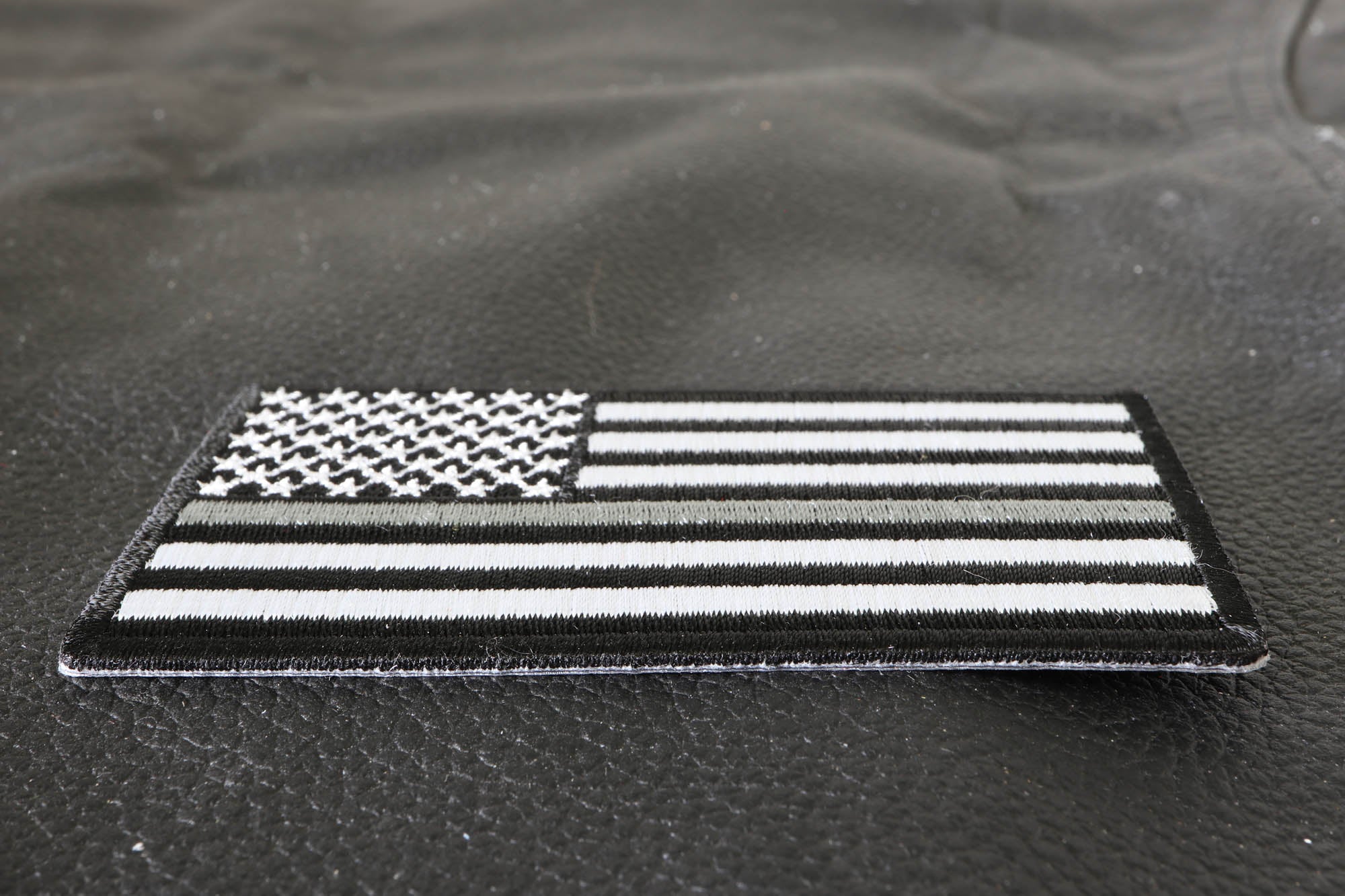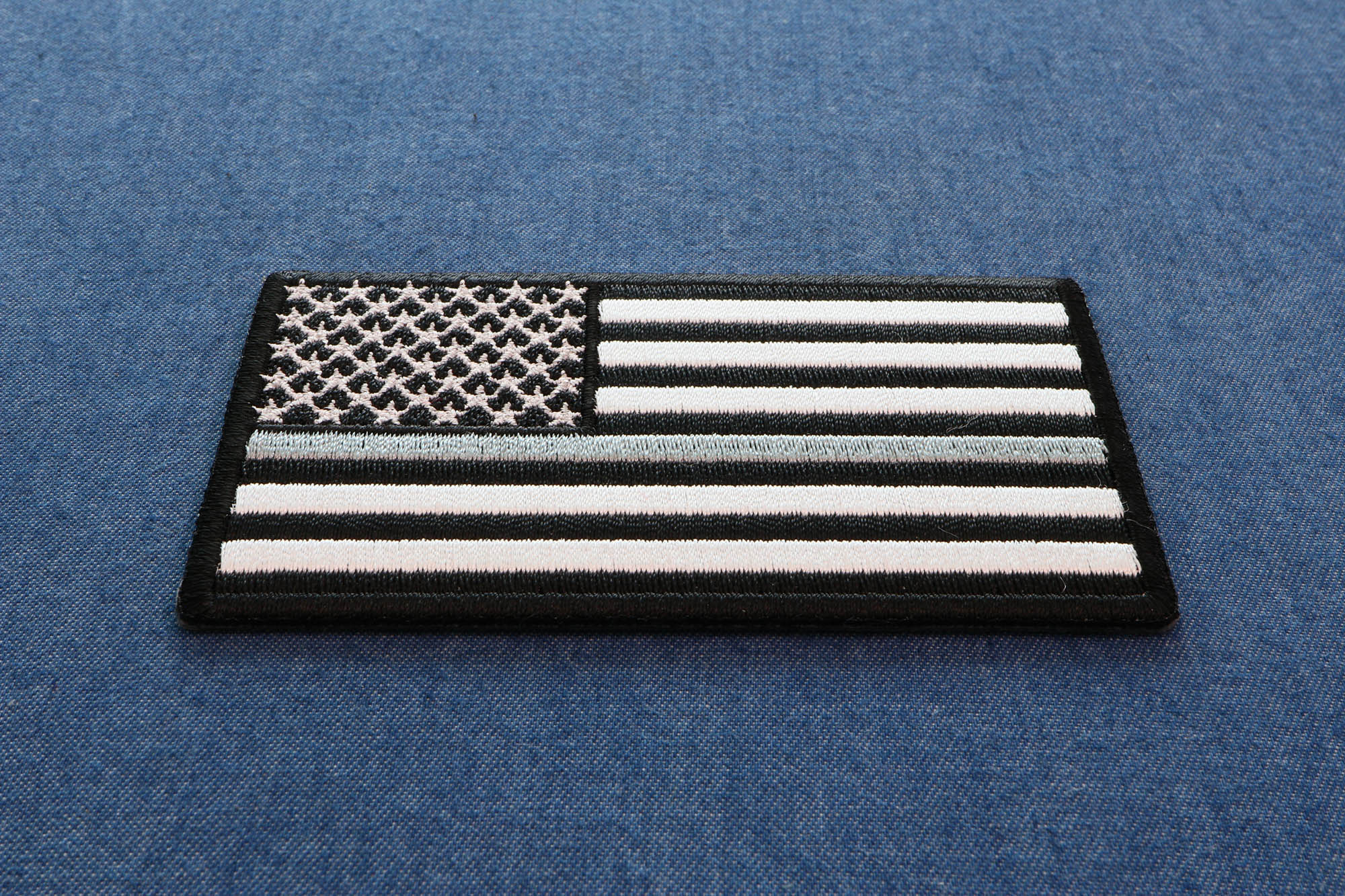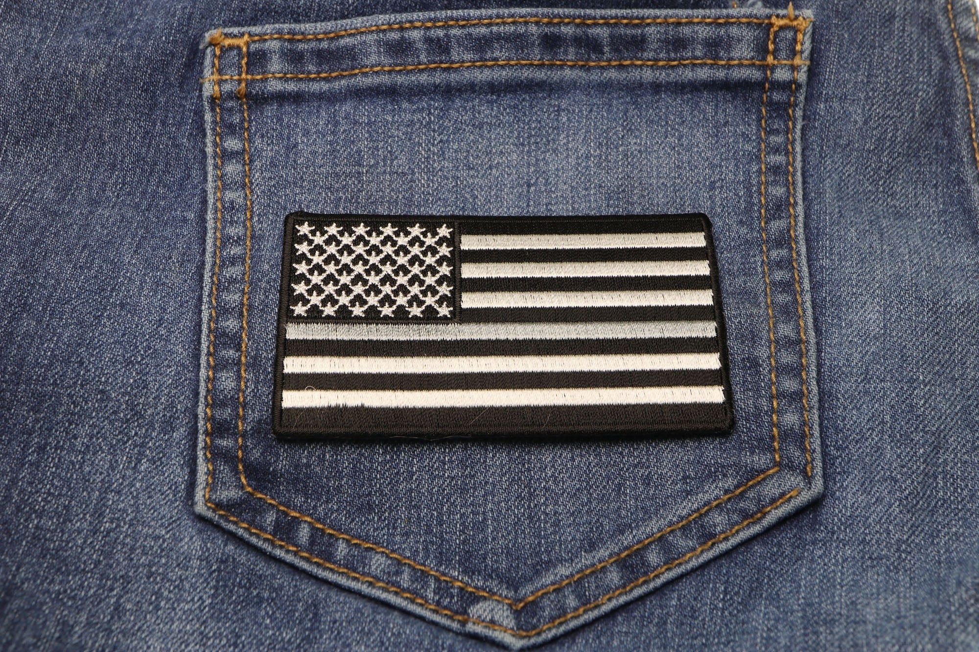 Thin Silver Line American Flag for Corrections measures 3.5x2 inches and is Embroidered in Black / White / Gray. The Small Patch can be sewn on or ironed on to clothing such as Denim or Leather Jackets, Vests, Hats, Back Packs, Shirts. Features plastic backing and embroidered die cut borders.
