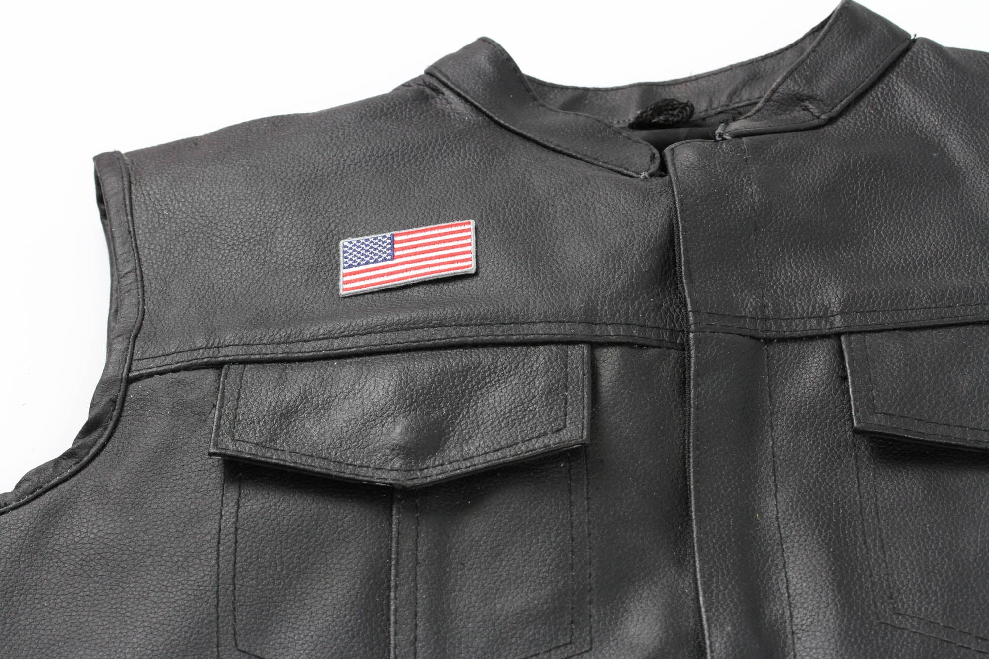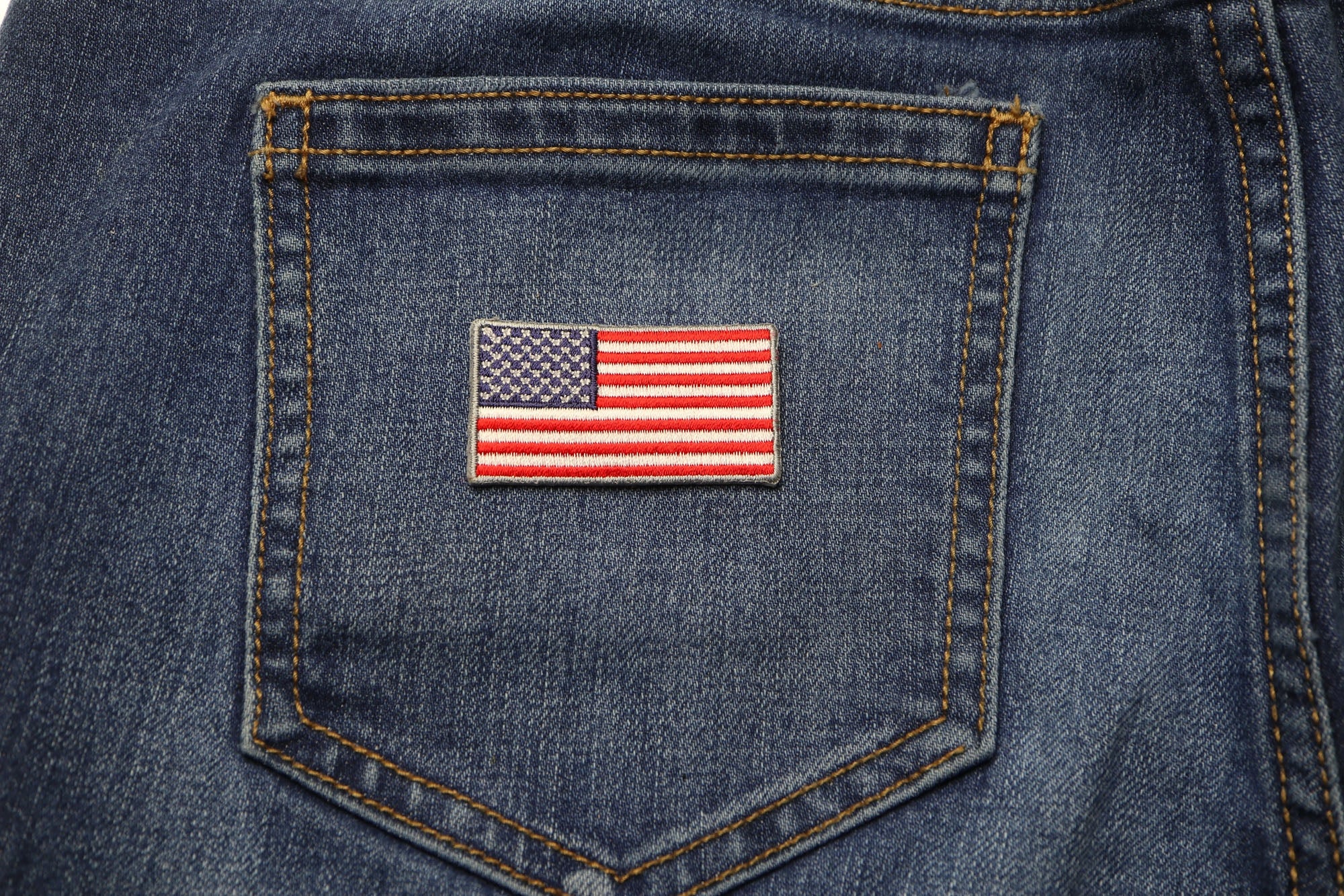 US Flag Patch Silver Border 2 inch measures 2x1.1 inches and is Embroidered in Red / White / Blue / Gray. The Small Patch can be sewn on or ironed on to clothing such as Denim or Leather Jackets, Vests, Hats, Back Packs, Shirts. Features plastic backing and embroidered die cut borders.
