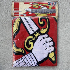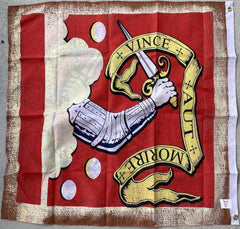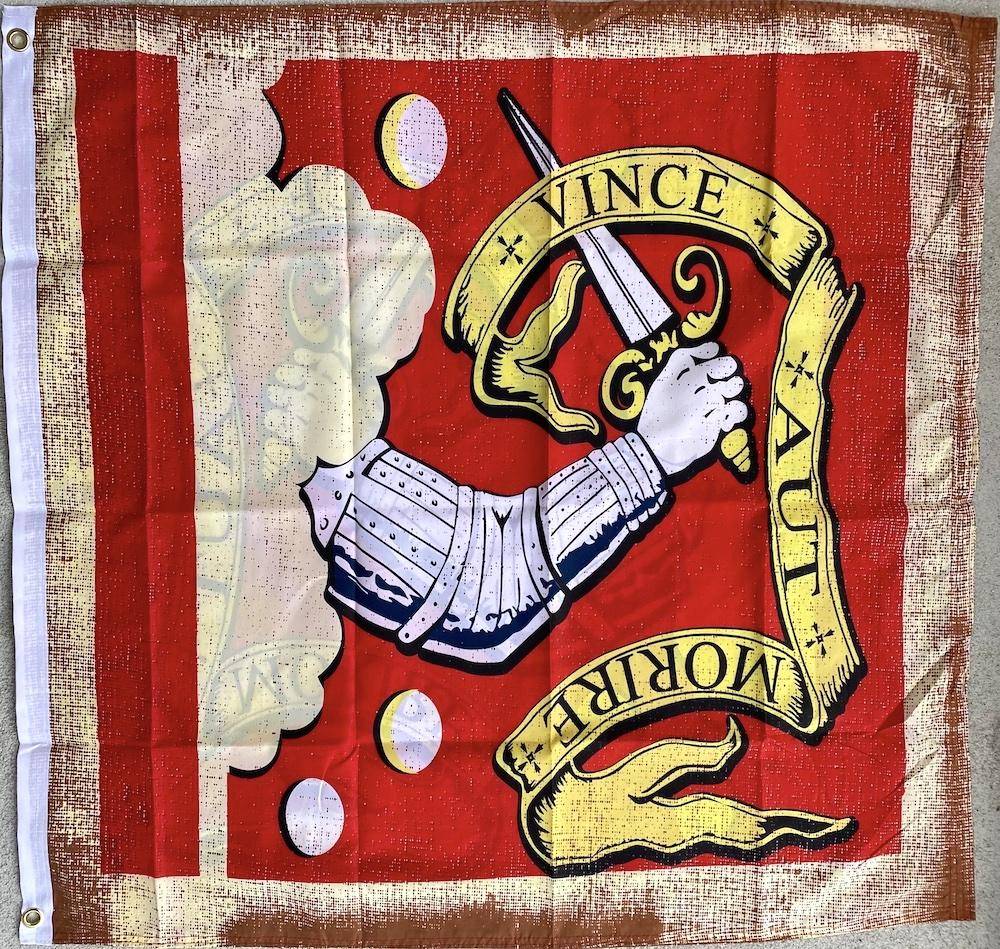 The Bedford Flag is the oldest complete flag known in the United States. It was carried by Bedford Massachusetts Minuteman, Nathaniel Page, to the Concord Bridge on April 19, 1775, the beginning of the American Revolution. This flag was already old when used that day, since it had been made in the early 1700's and used by a cavalry troop of the Massachusetts Bay militia in the French and Indian Wars. The emblem shows an armored arm emerging from clouds and grasping a sword. Three cannonballs are shown in the air. Around the arm is a gold ribbon with Latin words "VINCE AUT MORIRE" (Conquer or Die).