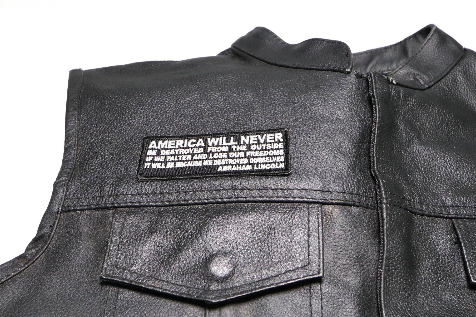 • America Will Never Be Destroyed From the Outside If We Falter and Lose Our Freedoms It will be because we destroyed Ourselves Abraham Lincoln Patch Description: