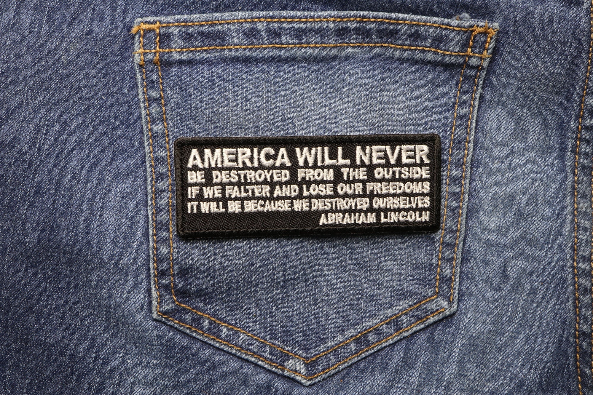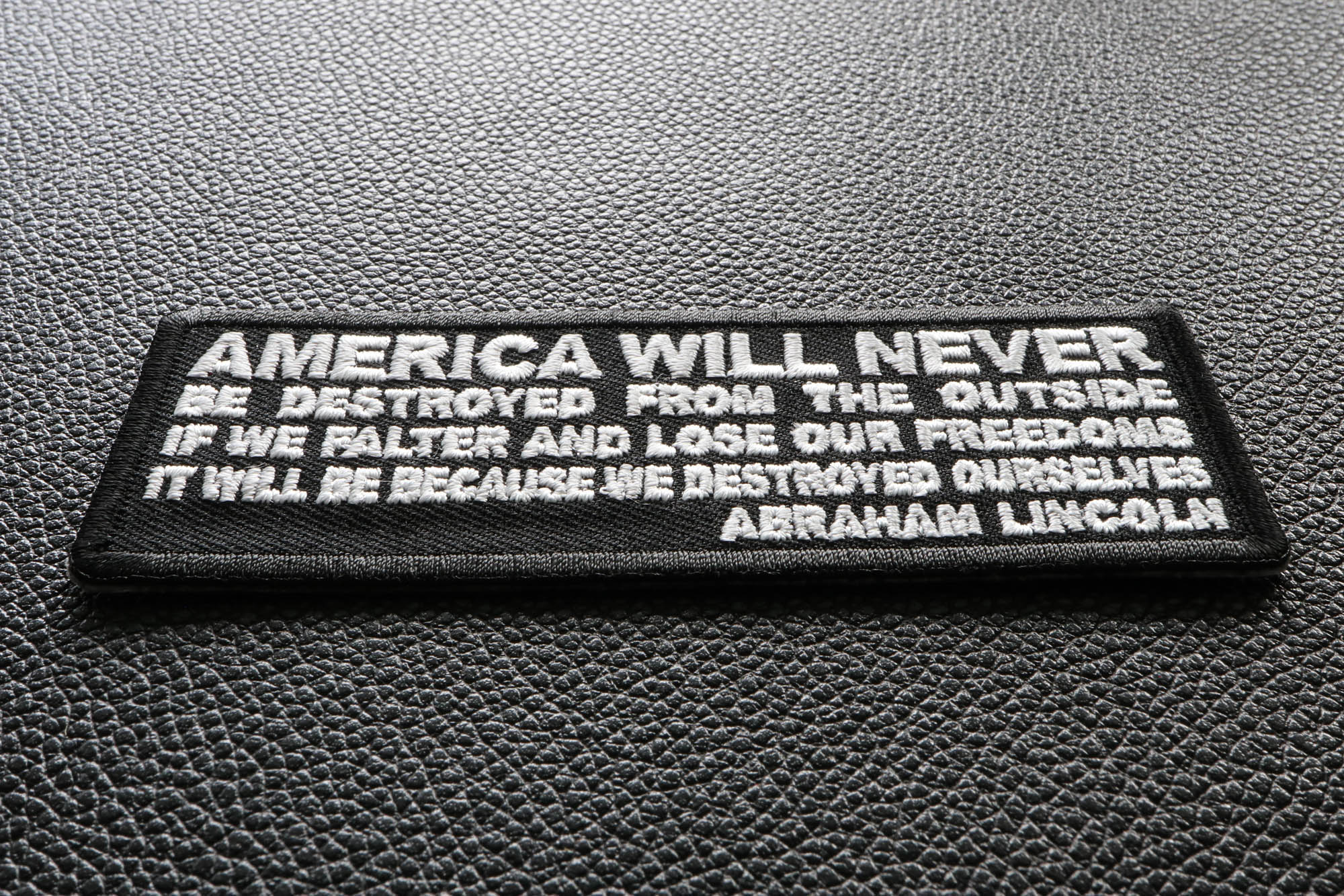 America Will Never Be Destroyed From the Outside If We Falter and Lose Our Freedoms It will be because we destroyed Ourselves Abraham Lincoln Patch - 4x1.5 inch