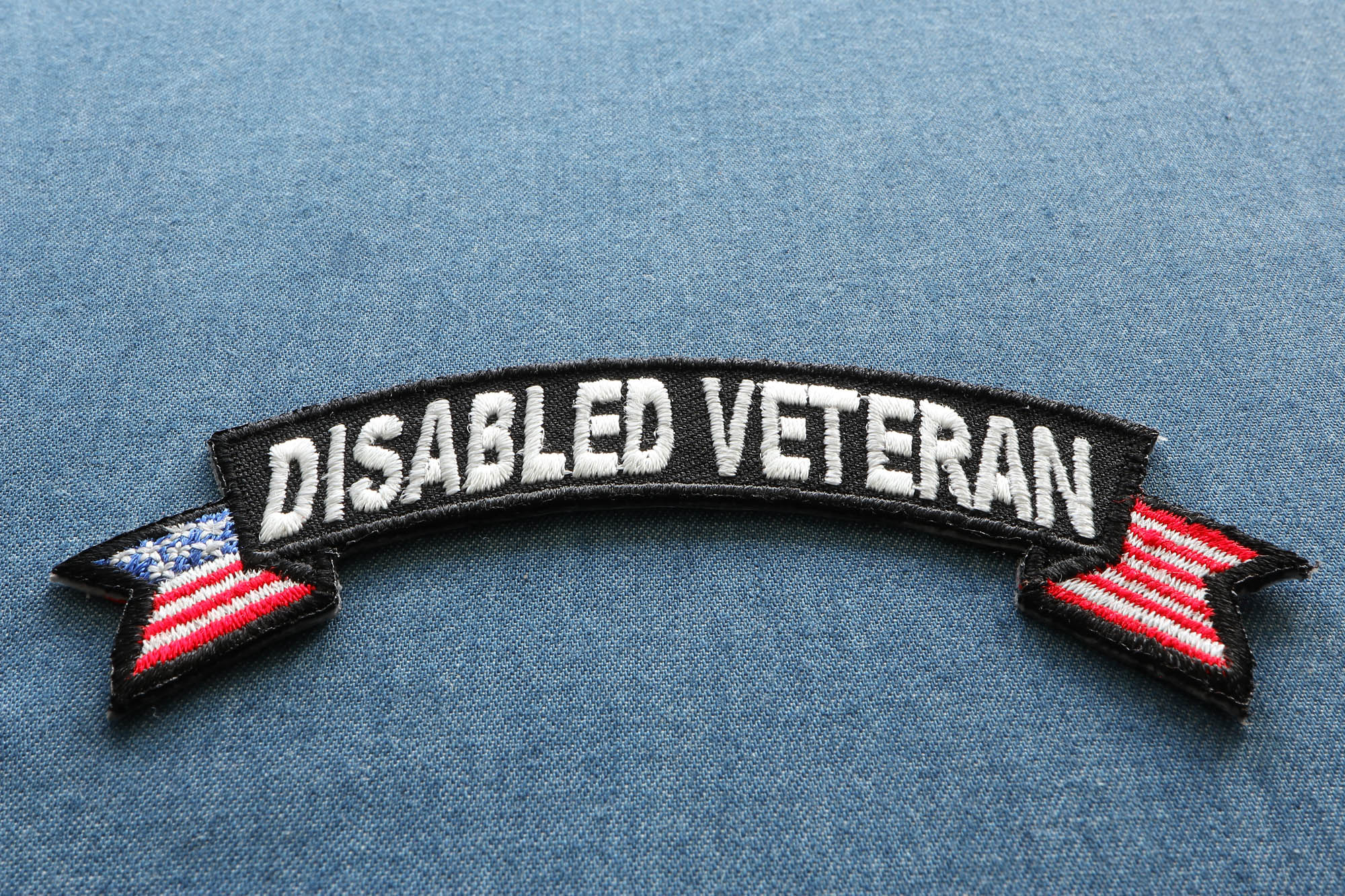 • This patch says Disabled veteran with the American flag colors embroidered at the tips of the rocker measuring 4x1.5 inches. Embroidered in red, white and blue over black.