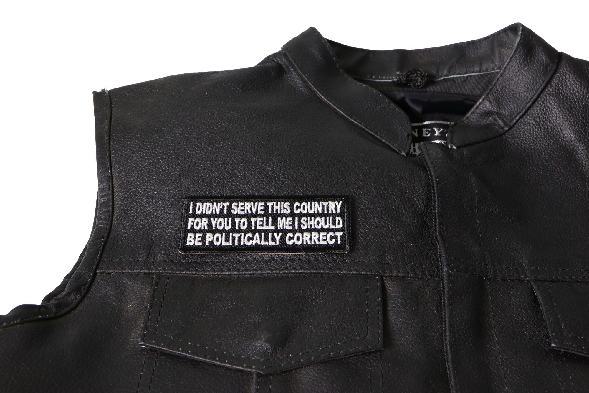 I didn't serve this country for you to tell me I should be politically correct Patch measures 4x1.5 inches and is Embroidered in Black / White. The Small Patch can be sewn on or ironed on to clothing such as Denim or Leather Jackets, Vests, Hats, Back Packs, Shirts. Features plastic backing and embroidered die cut borders.