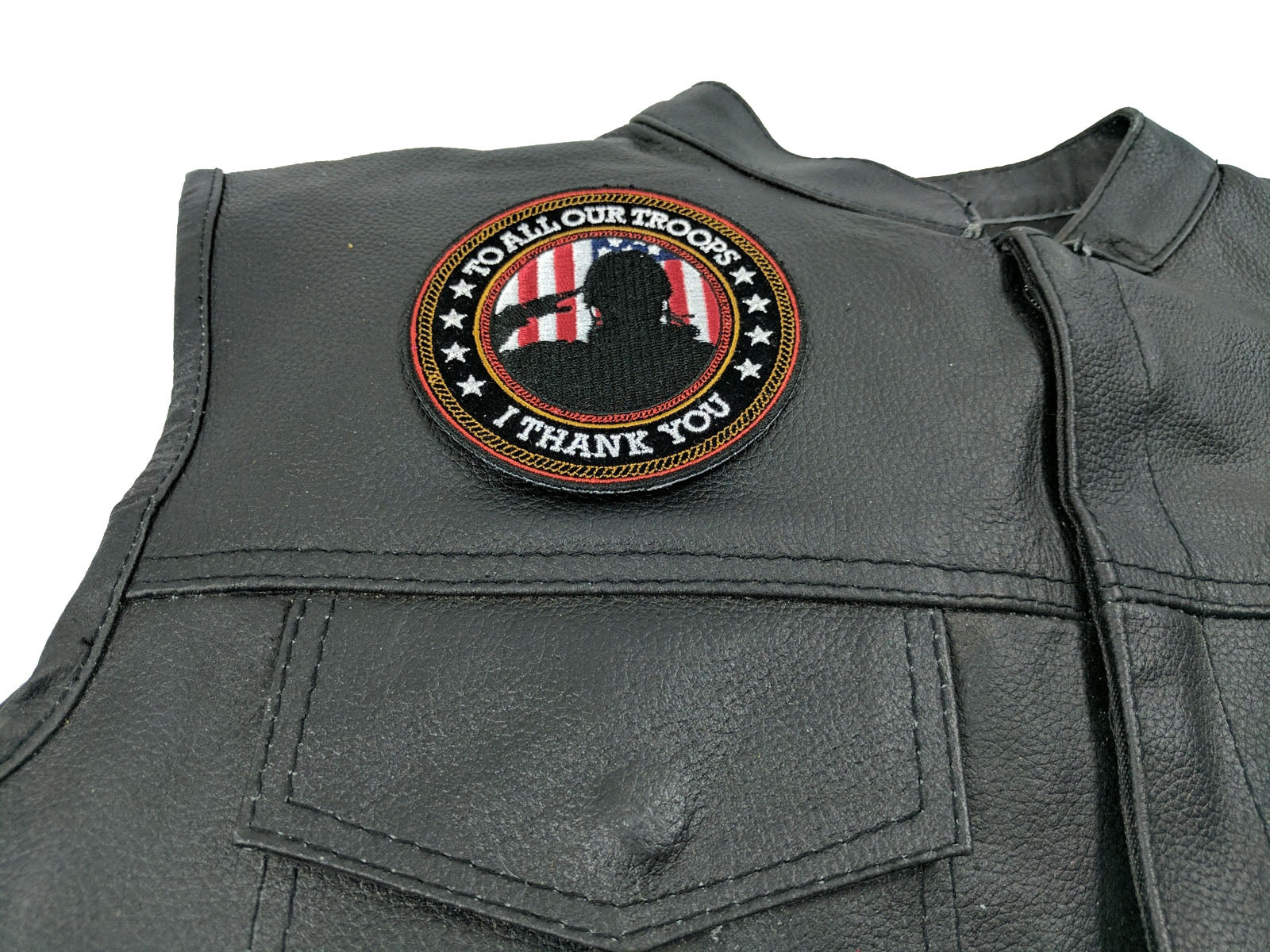 I thank you Patch To All our Troops Round measures 3.75x3.75 inches and is Embroidered in Black / White / Blue / Red. The Small Patch can be sewn on or ironed on to clothing such as Denim or Leather Jackets, Vests, Hats, Back Packs, Shirts. Features plastic backing and embroidered die cut borders. Patch features a silhouette of a saluting American Soldier with the US flag in color on the background. It says To All Our Troops I thank you around the circumference. Beautiful design, a way to show your appreciation for those who risk their lives. Freedom isn't free, don't ever take it for granted.