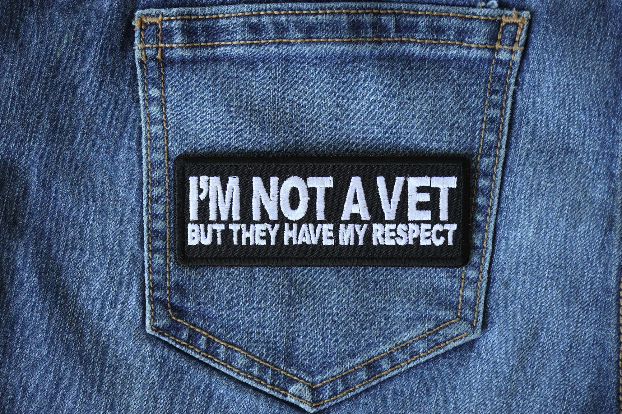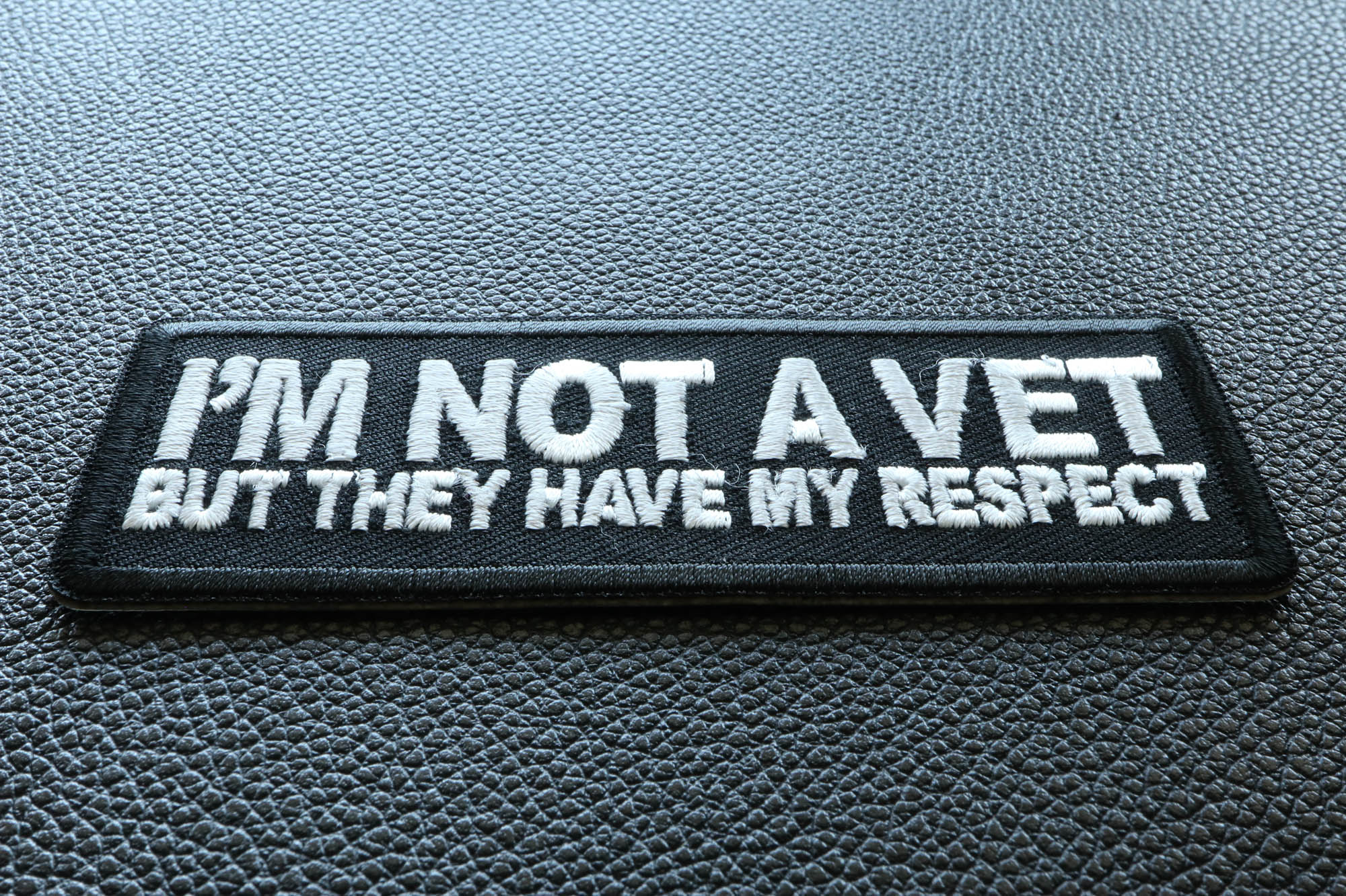 I'm Not a Vet But They Have my Respect Patch measures 4x1.5 inches and is Embroidered in Black / White. The Small can be sewn on or ironed on to clothing. The I'm Not a Vet But They Have my Respect Patch features plastic iron on backing and clean laser cut embroidered borders.