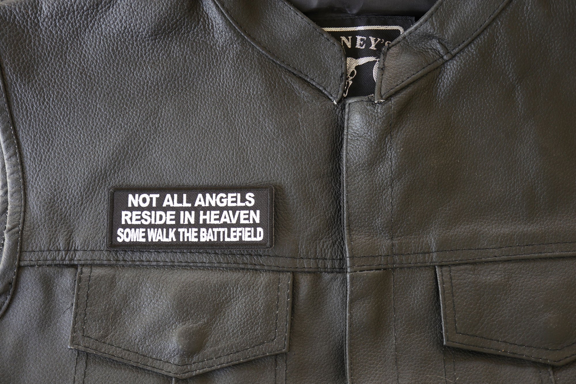 Not All Angels Reside in Heaven Some Walk the Battlefield Patch measures 4x1.5 inches and is Embroidered in Black / White. The Small Patch can be sewn on or ironed on to clothing such as Denim or Leather Jackets, Vests, Hats, Back Packs, Shirts. Features plastic backing and embroidered die cut borders.