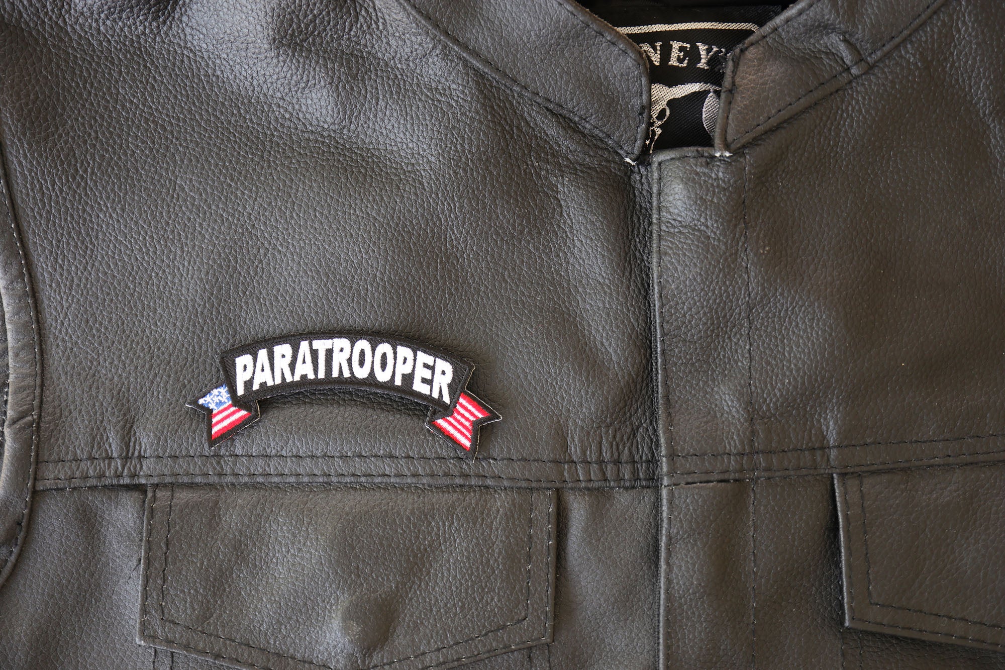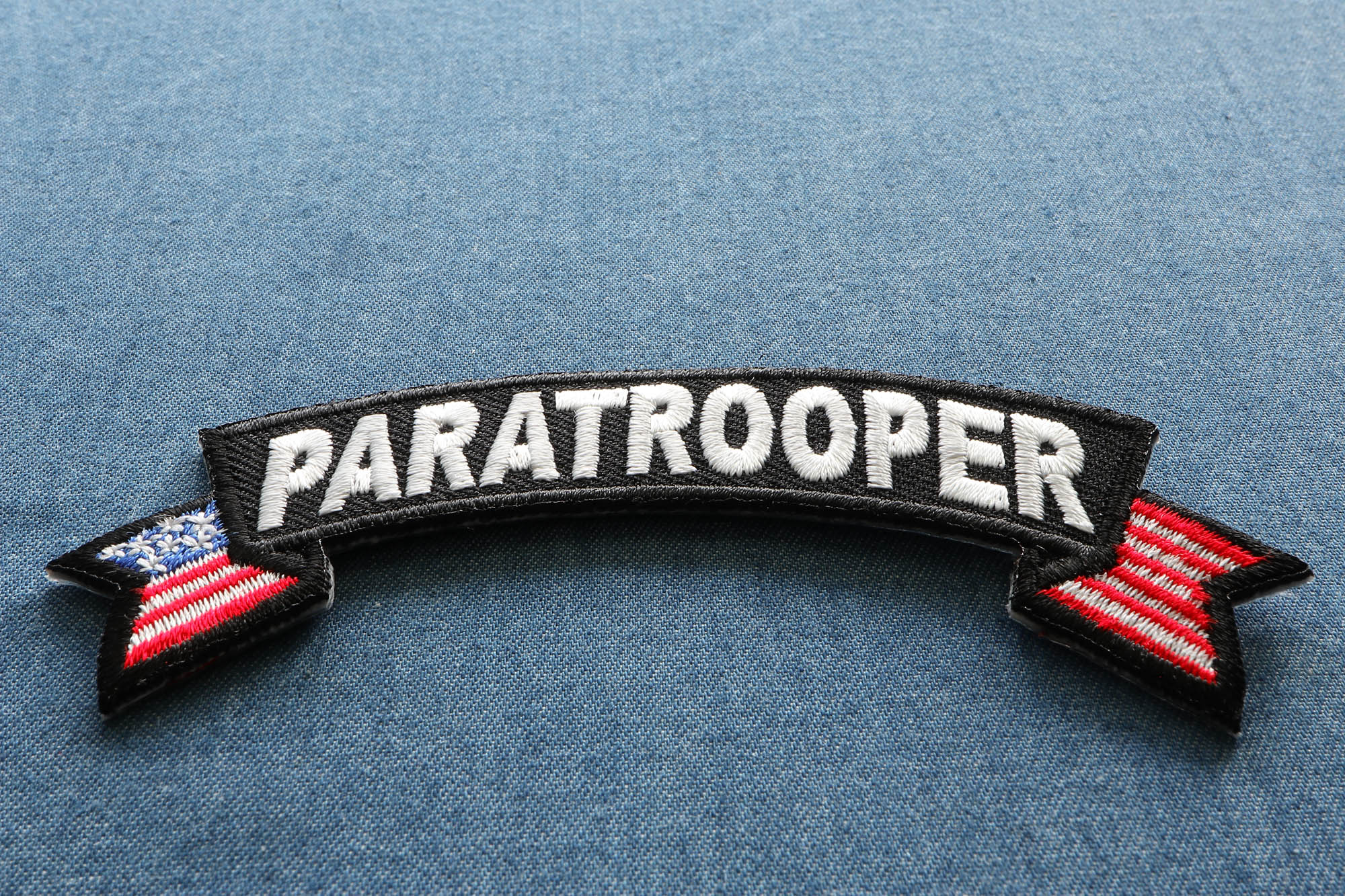 Paratrooper Small Flag Rocker Patch measures 4x1.5 inches and is Embroidered in Red / White / Blue / Black. The Small can be sewn on or ironed on to clothing. The Paratrooper Small Flag Rocker Patch features plastic iron on backing and clean laser cut embroidered borders.