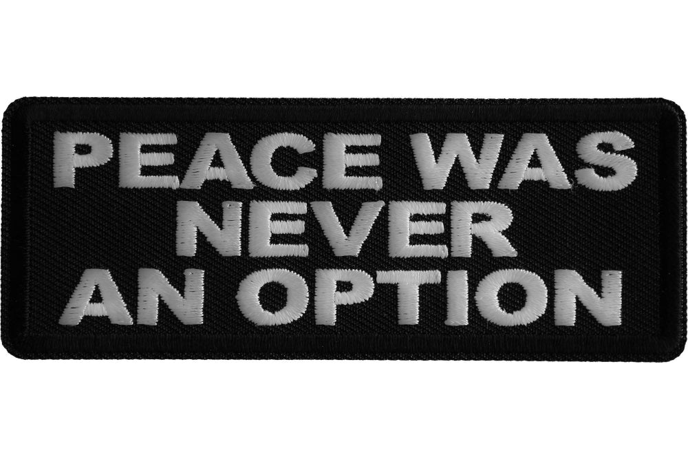 Peace Was Never an Option Iron on Patch measures 4x1.5 inches and is Embroidered in Black / White. The patch can be sewn on to Leather Biker Jackets, Vests or Chaps. The patch can also be ironed on to Shirts, Hats or Denim material such as Jeans. Features plastic iron on backing and clean laser cut embroidered borders. Japanese made iron on glue requires temperature between 270-290 Degrees Fahrenheit. Use a heat press for 30 seconds to adhere the patch permanently to your clothing. Using a regular household iron will probably not be as permanent as one hopes. If possible we recommend you sew on your patches for a more durable application. Never iron on patches to Leather or Nylon materials.