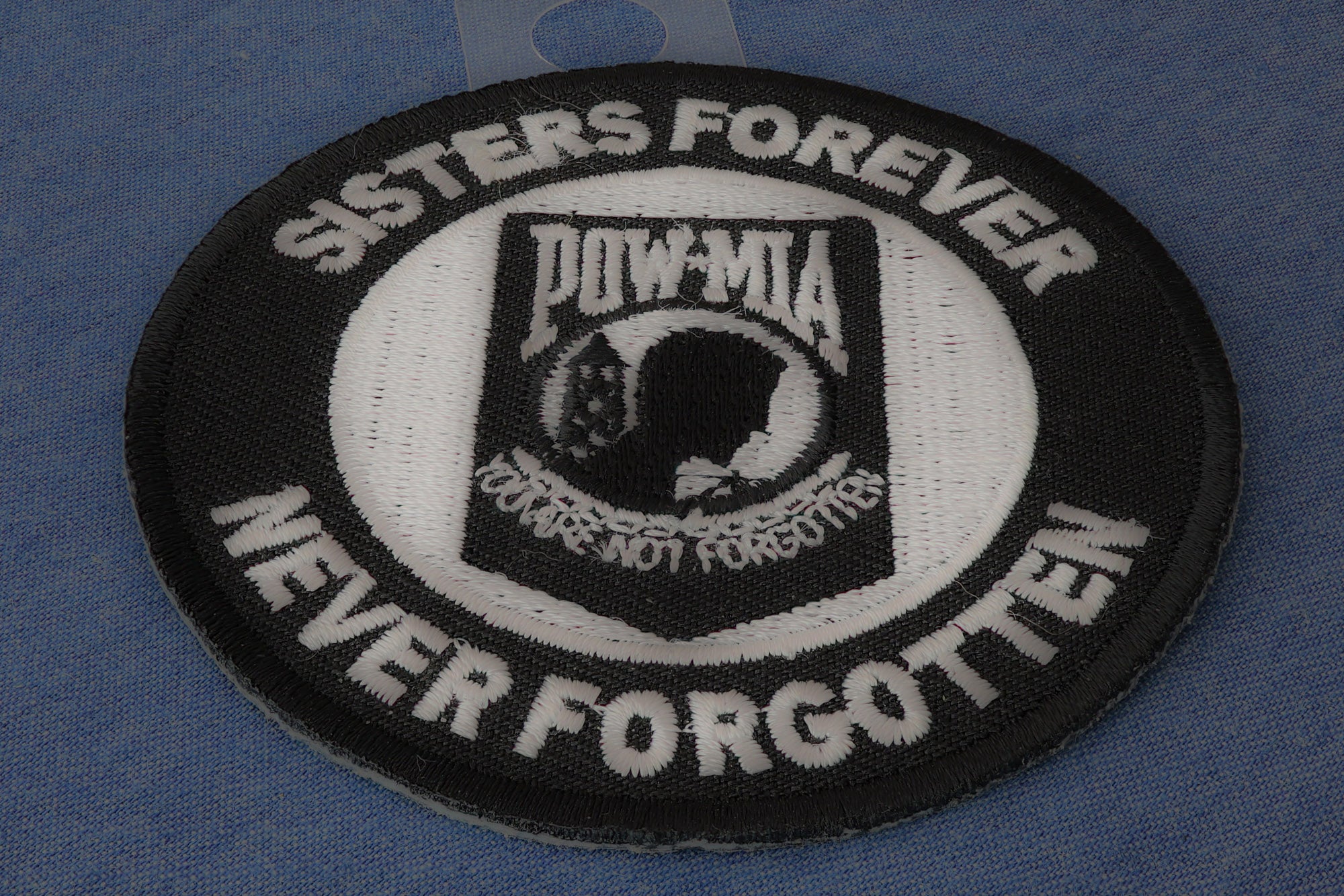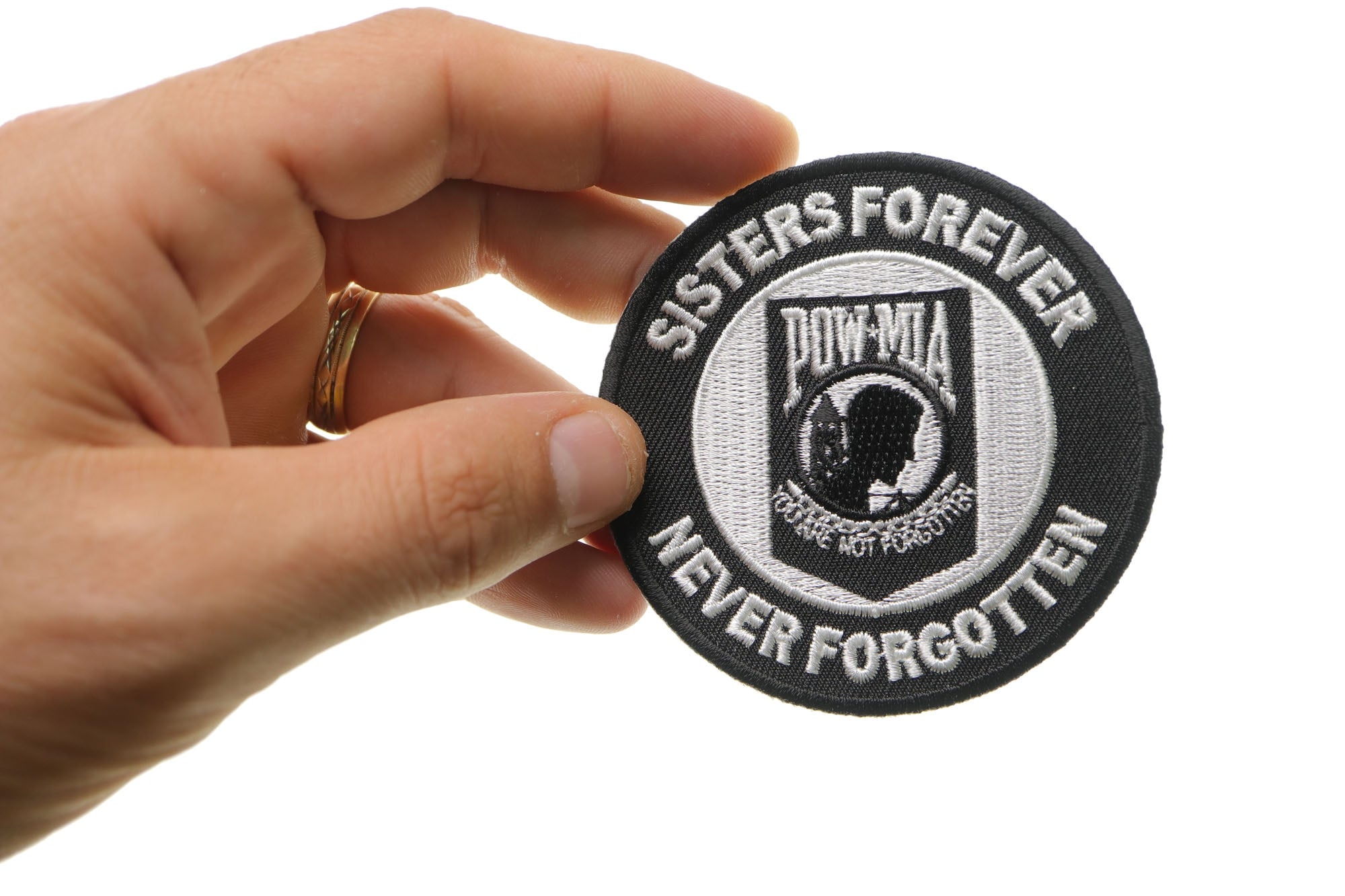• Sisters Forever, Never Forgotten POW MIA Patch measures 3 inches. Embroidered in white over black the patch can be sewn or ironed on.