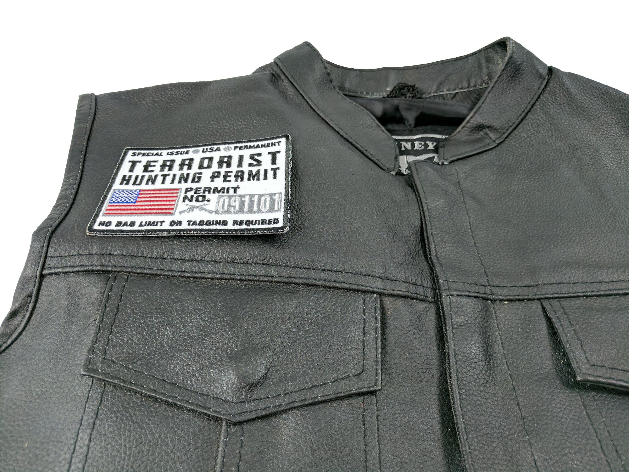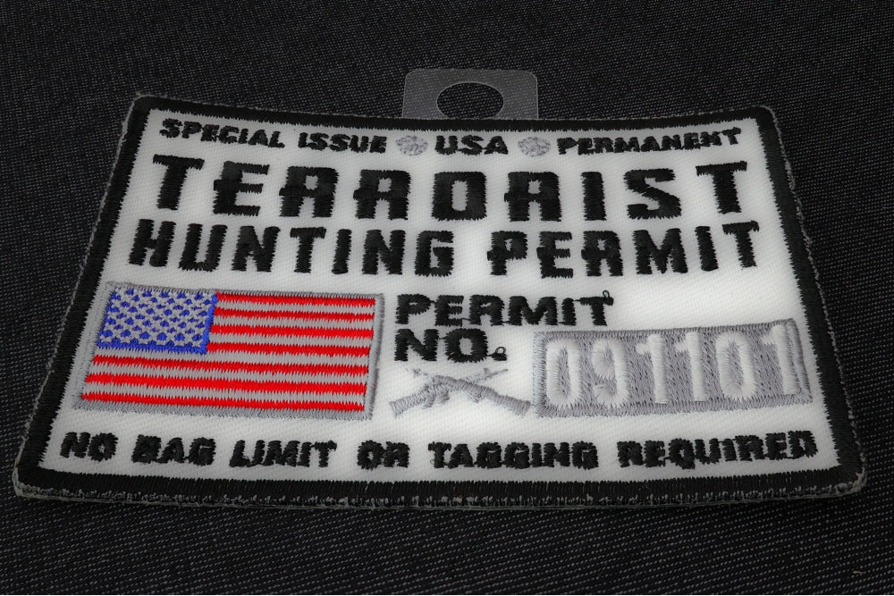 Terrorist Hunting Permit White Patch measures 3.75x3 inches and is Embroidered in White / Red / Black / Red / Blue. The Small Patch can be sewn on or ironed on to clothing such as Denim or Leather Jackets, Vests, Hats, Back Packs, Shirts. Features plastic backing and embroidered die cut borders.