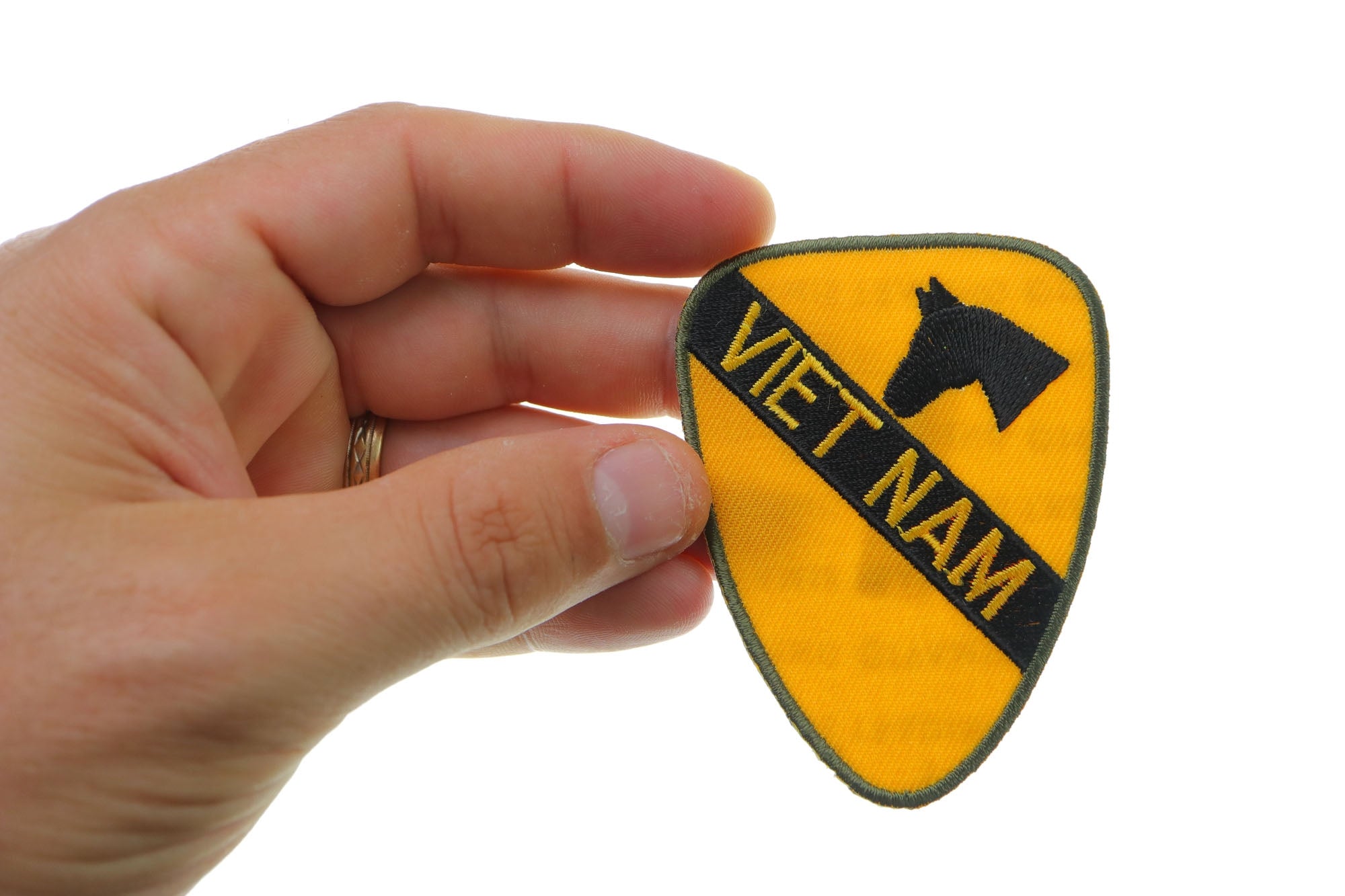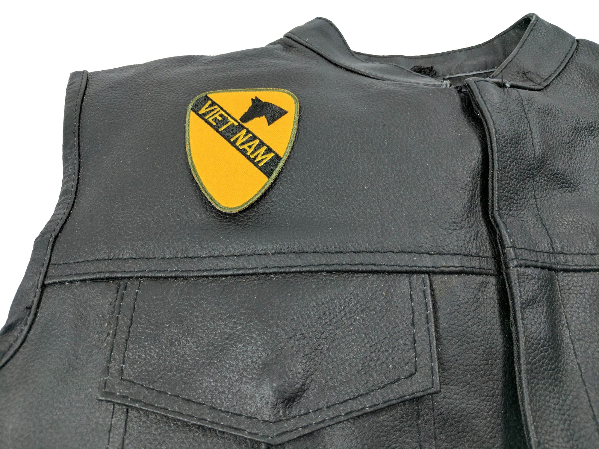 Vietnam 1st Cavalry Patch measures 2.3x3 inches and is Embroidered in Black / Yellow. The Small Patch can be sewn on or ironed on to clothing such as Denim or Leather Jackets, Vests, Hats, Back Packs, Shirts. Features plastic backing and embroidered die cut borders.