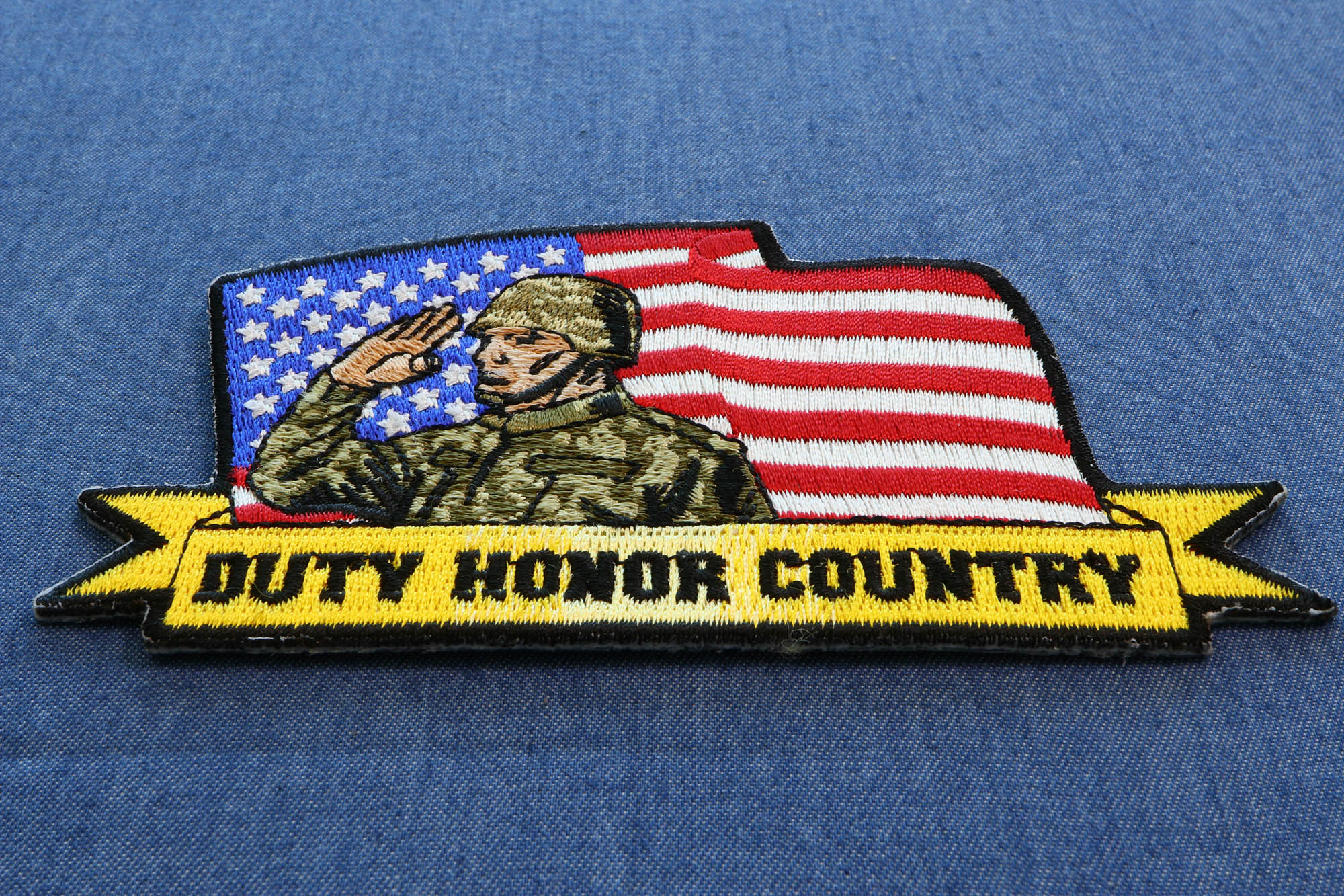 • Duty Honor Country Patch Soldier Saluting with American Flag Description: