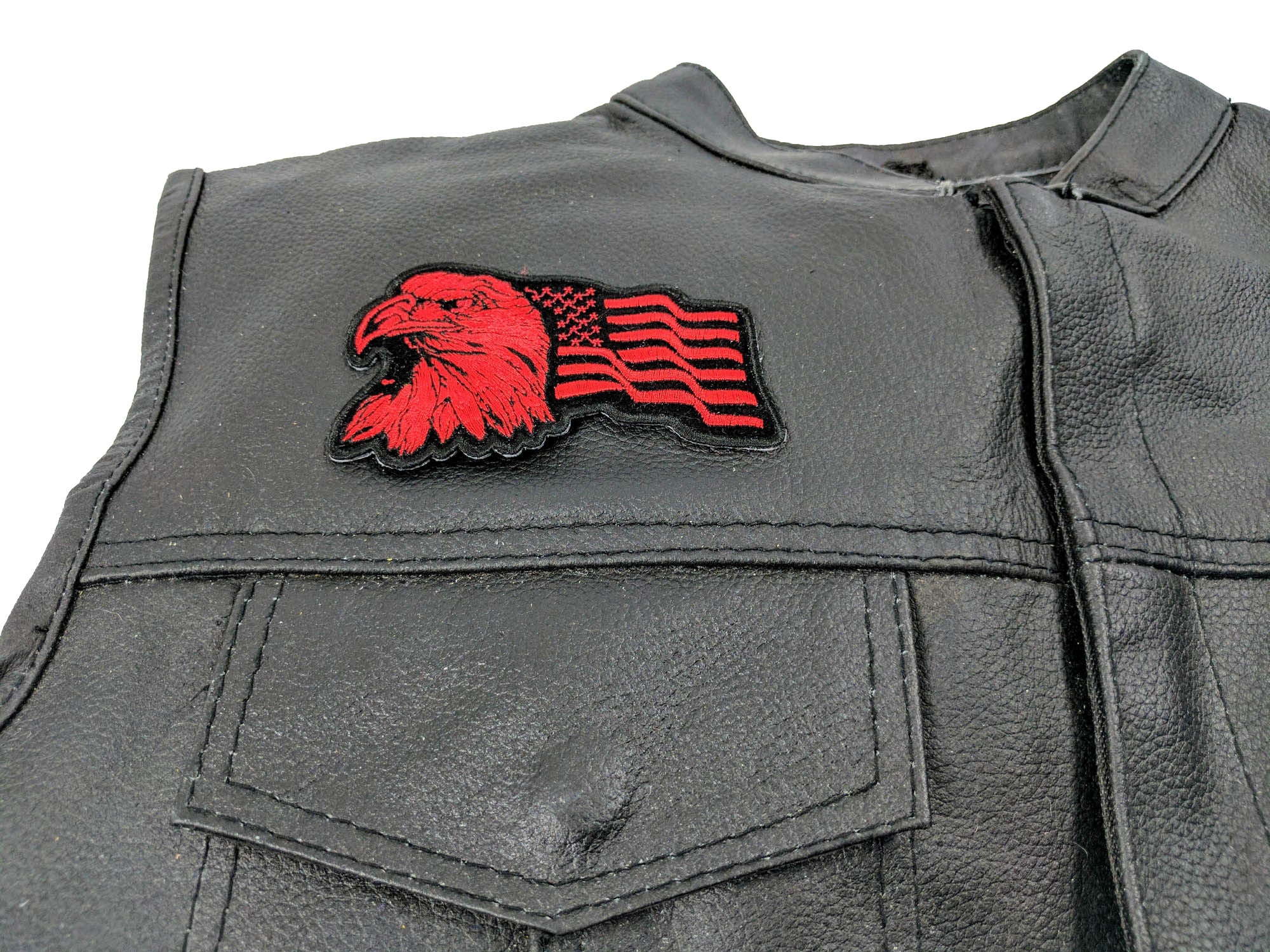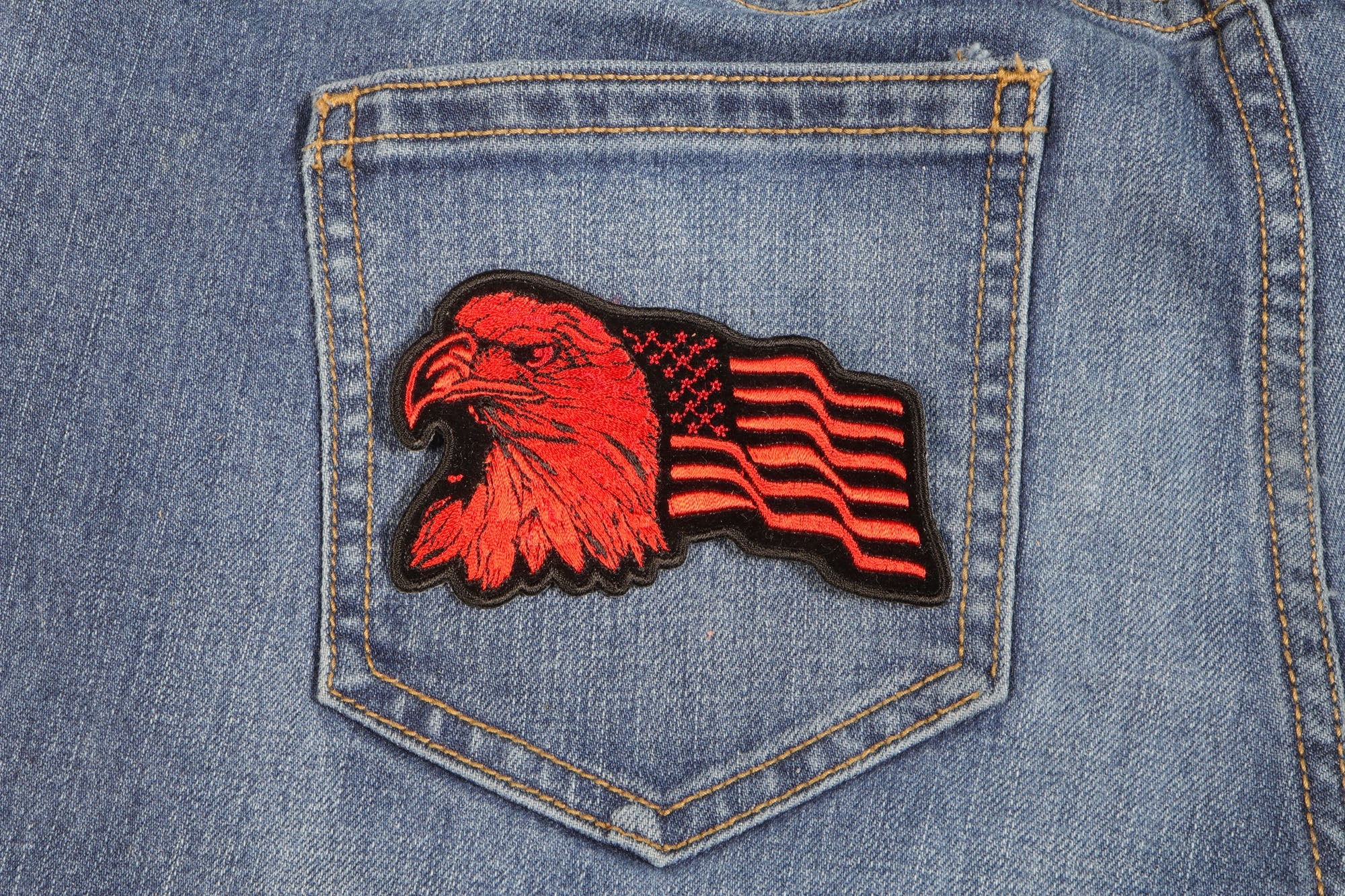 • Eagle US Flag Facing Left Patriotic Iron on Patch In Red Description: