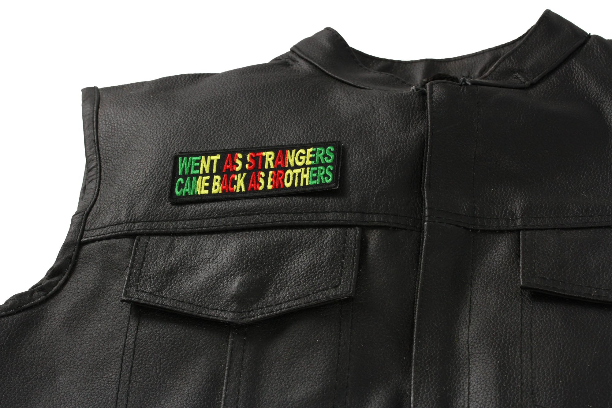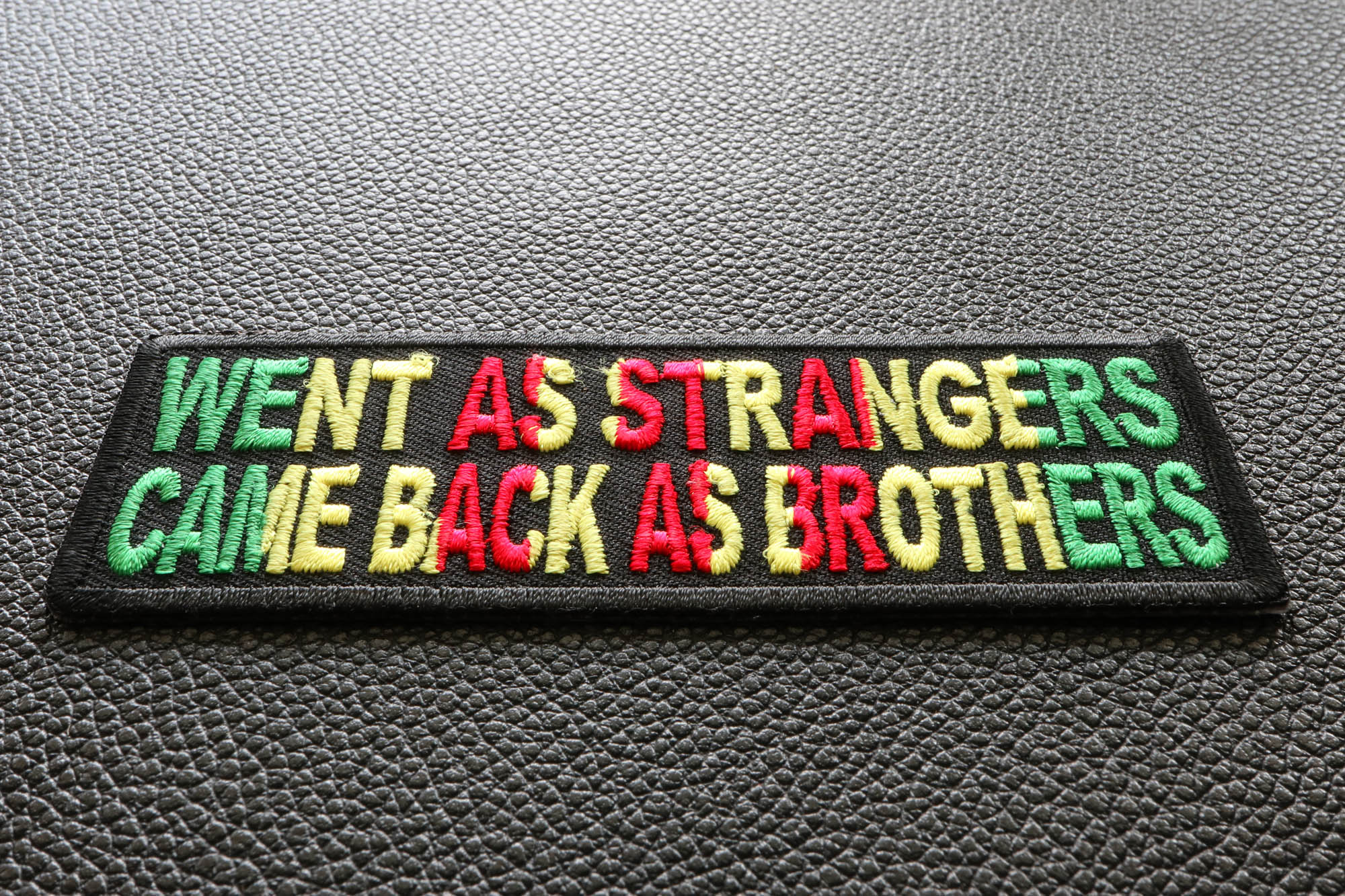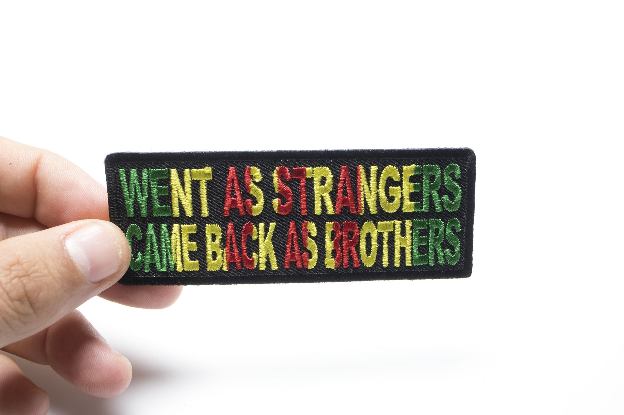 Went as Strangers Came Back as Brothers Vietnam War Patch measures 4x1.5 inches and is Embroidered in Black / Green / Yellow / Red. The Small Patch can be sewn on or ironed on to clothing such as Denim or Leather Jackets, Vests, Hats, Back Packs, Shirts. Features plastic backing and embroidered die cut borders.