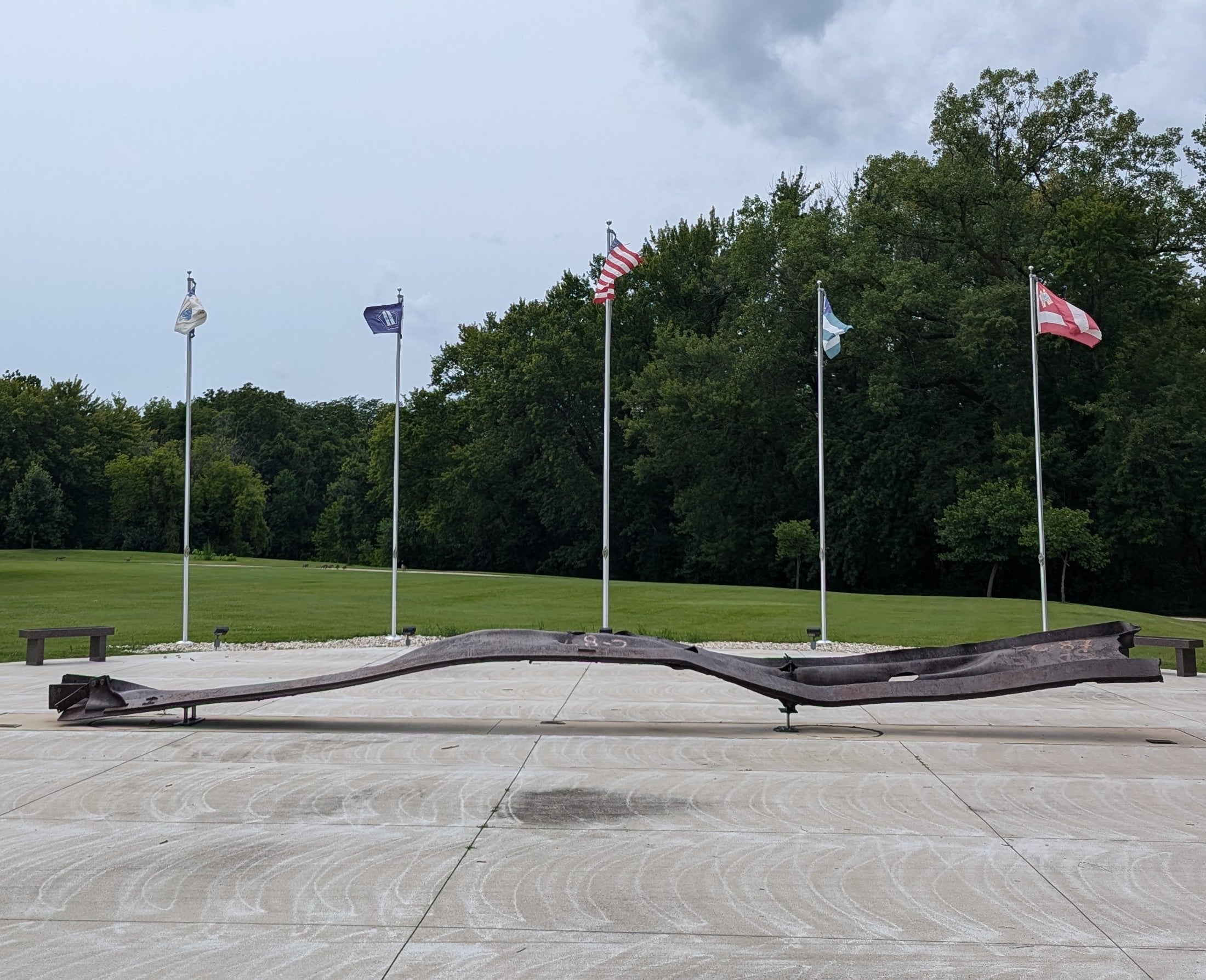 The Cherry Valley 9/11 Memorial, nestled within the serene expanse of Bauman Park, stands as a poignant tribute to the victims and heroes of the September 11, 2001, terrorist attacks. This thoughtfully designed memorial features a striking steel beam from the World Trade Center, symbolizing resilience and the enduring spirit of unity in the face of tragedy. Surrounding the beam are engraved plaques bearing the names of those who lost their lives, ensuring that their memory lives on. The tranquil setting of Bauman Park, with its lush greenery and reflective spaces, provides a place for contemplation and remembrance, inviting visitors to honor the legacy of courage and sacrifice that emerged from that fateful day. The Cherry Valley 9/11 Memorial serves as a powerful reminder of the strength and solidarity that define the American spirit. This park features this flag from our company.