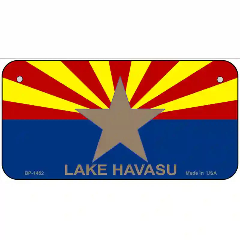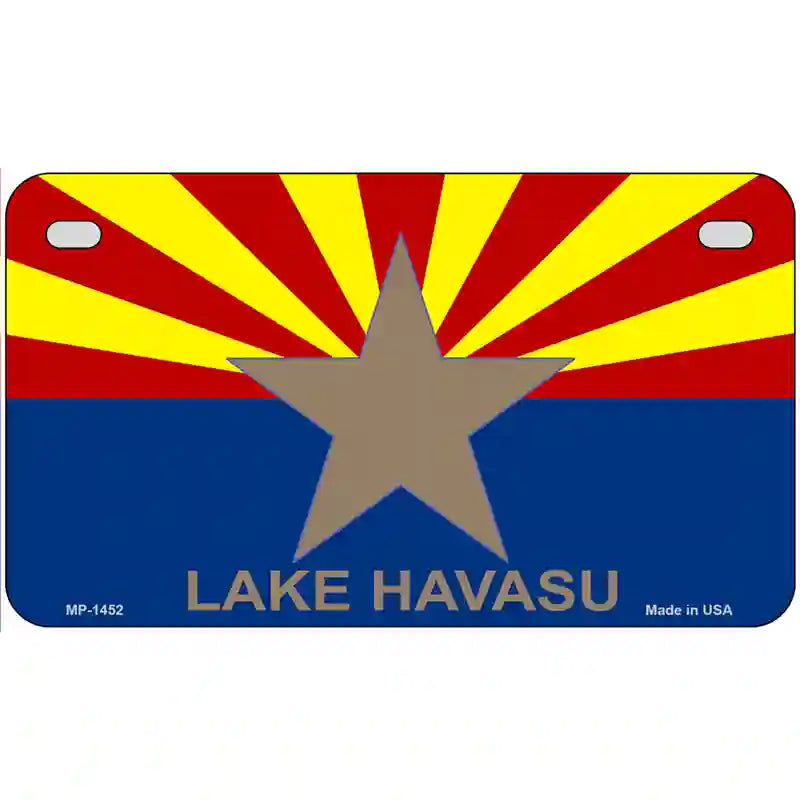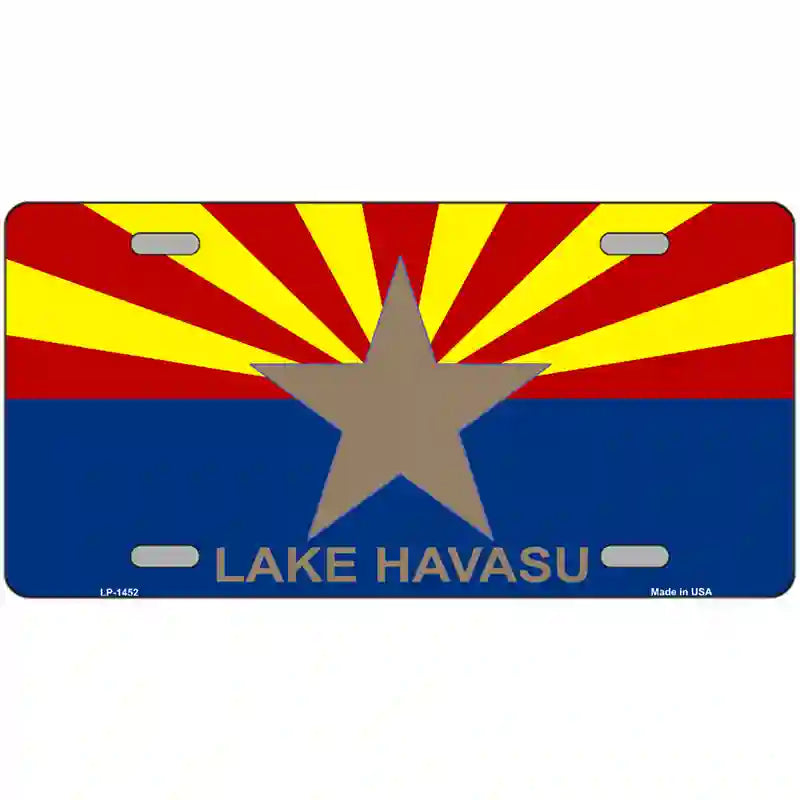 Lake Havasu Arizona State Flag Metal License Plate. Offering our unique license plate designs in a 12" Standard Automotive License Plate, 7" Motorcycle/ATV Plate, 6" Bike Plate, 4" Miniature License Plate and 24" large license plate garage sign. The 12" x 6" License Plate is made out of a .032 grade aluminum and the other sizes are made out of a .025 grade aluminum, which make them lightweight and durable. All license plates will have pre-drilled holes making these decorative license plates easy to display. Choose between the sizes offered or add all to your cart to show off your design in different ways. These items are proudly made here in the USA. Check out our other different sizes with the same artwork on them in our Key Chains, Rectangle Magnets, Dog Tag Necklaces, and Hat Pins.