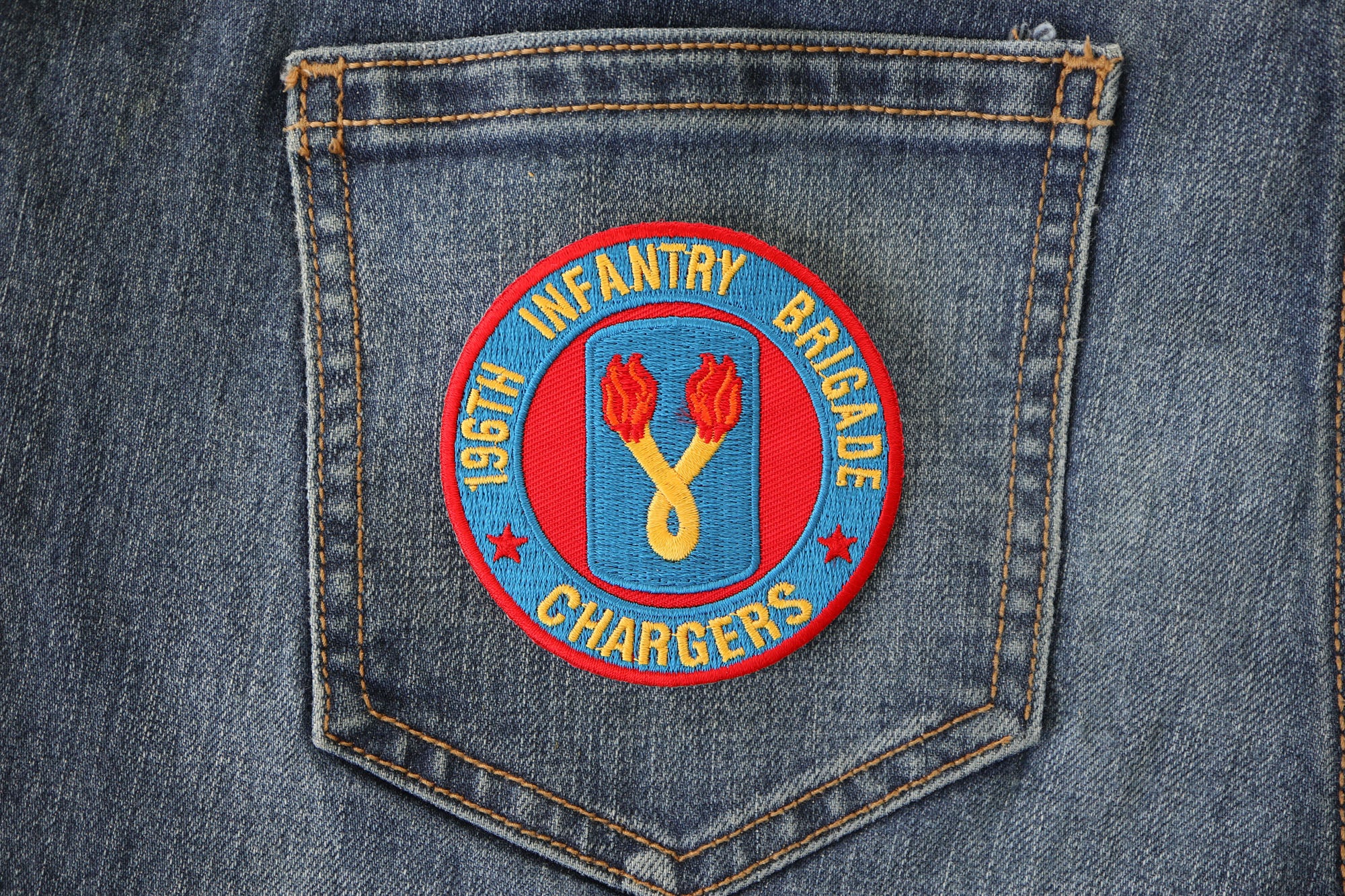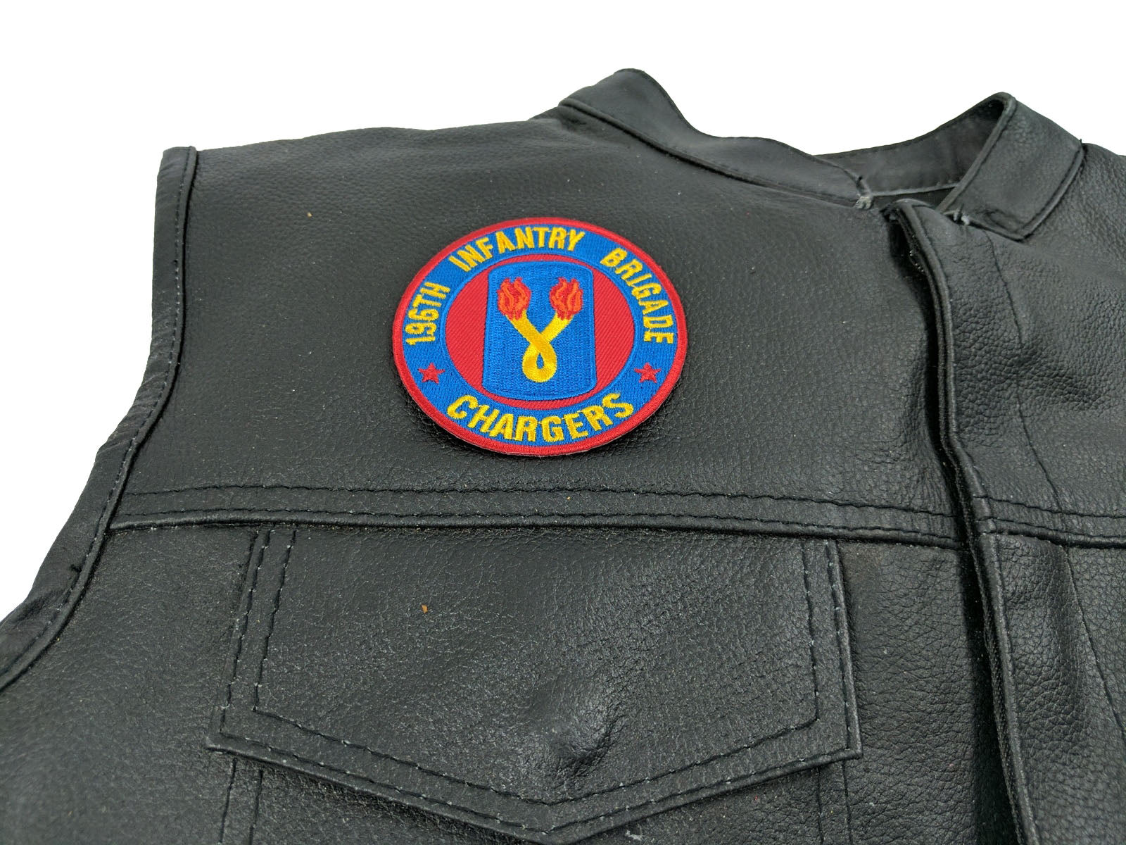 196th Infantry Brigade Patch Chargers measures 3x3 inches and is Embroidered in Blue / Red / White / Yellow. The Small Patch can be sewn on or ironed on to clothing such as Denim or Leather Jackets, Vests, Hats, Back Packs, Shirts. Features plastic backing and embroidered die cut borders.