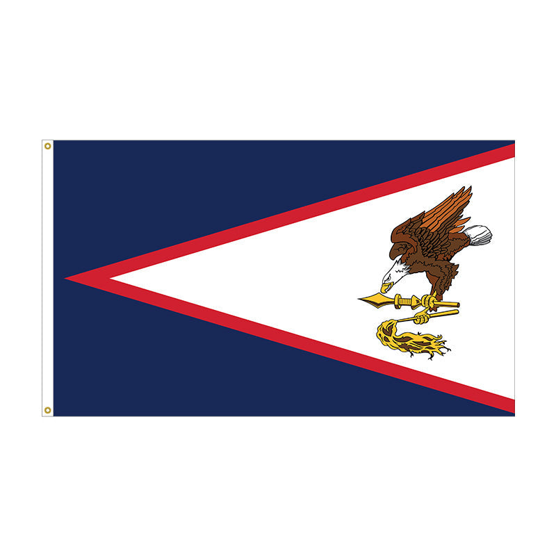 The American Samoa flag, adopted in 1960, symbolizes cultural pride and U.S. ties. Its blue, red, and white colors reflect freedom, courage, and unity, echoing the U.S. flag. A bald eagle at the center holds a Fue (whisk) for chiefly wisdom and a Uatogi (war club) for strength, blending Samoan tradition with territorial loyalty. Celebrate this heritage with our vibrant flags, up to 20x30 feet, crafted in the USA!