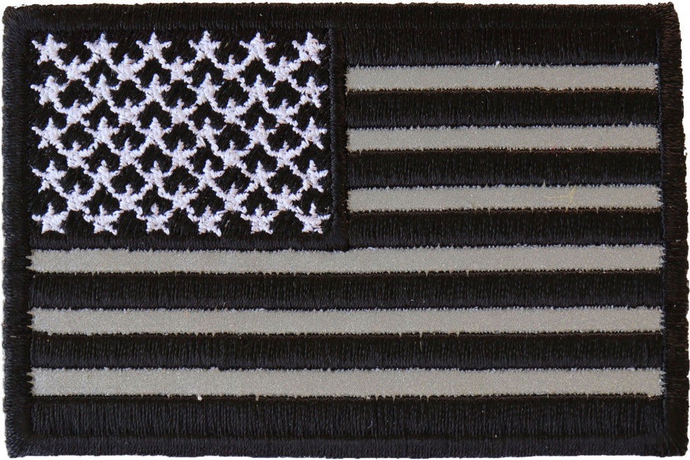 This is a reflective American flag patch that is embroidered in black stripes, white stars and reflective material stripes with black borders. 3x2 inches.