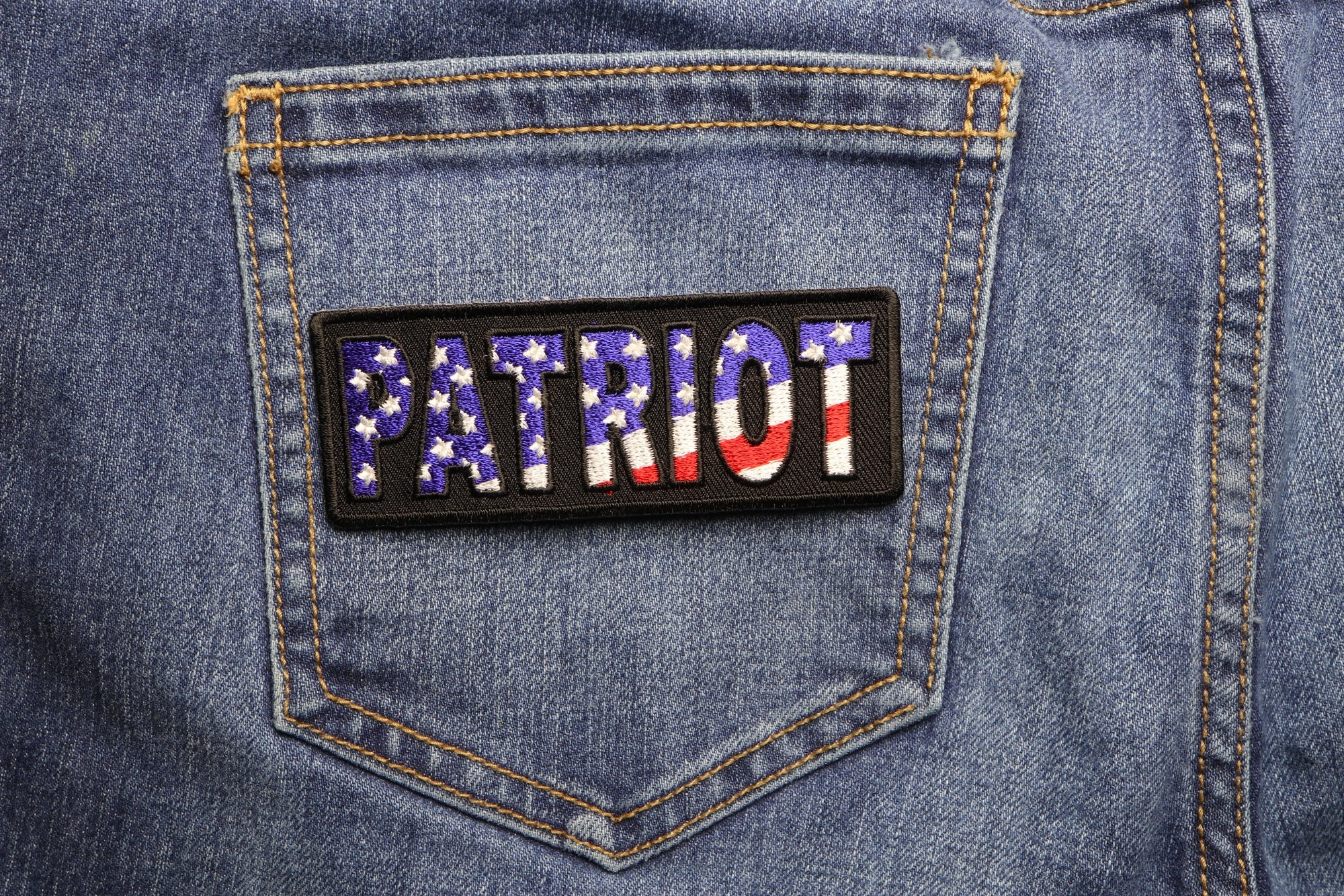 Patriot Patch measures 4x1.5 inches and is Embroidered in Black / White / Red / Blue. The Small Patch can be sewn on or ironed on to clothing such as Denim or Leather Jackets, Vests, Hats, Back Packs, Shirts. Features plastic backing and embroidered die cut borders.
