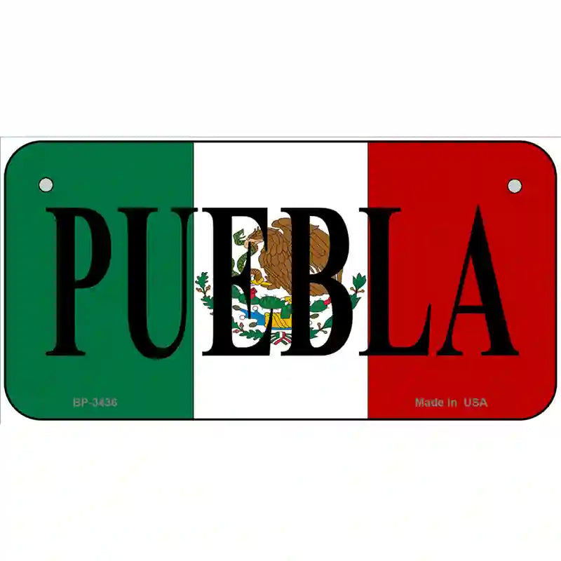 Puebla on Mexico Flag Metal Novelty License Plate. Offering our unique license plate designs in a 12" Standard Automotive License Plate, 7" Motorcycle/ATV Plate, 6" Bike Plate, 4" Miniature License Plate and 24" large license plate garage sign. The 12" x 6" License Plate is made out of a .032 grade aluminum and the other sizes are made out of a .025 grade aluminum, which make them lightweight and durable. All license plates will have pre-drilled holes making these decorative license plates easy to display. Choose between the sizes offered or add all to your cart to show off your design in different ways. These items are proudly made here in the USA. Check out our other different sizes with the same artwork on them in our Key Chains, Rectangle Magnets, Dog Tag Necklaces, and Hat Pins.
