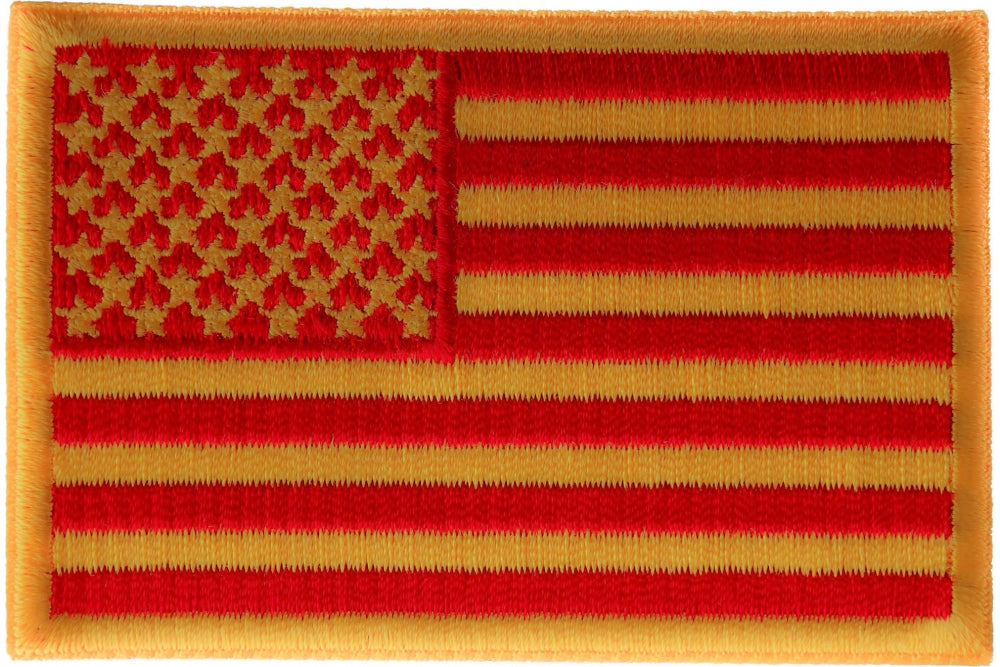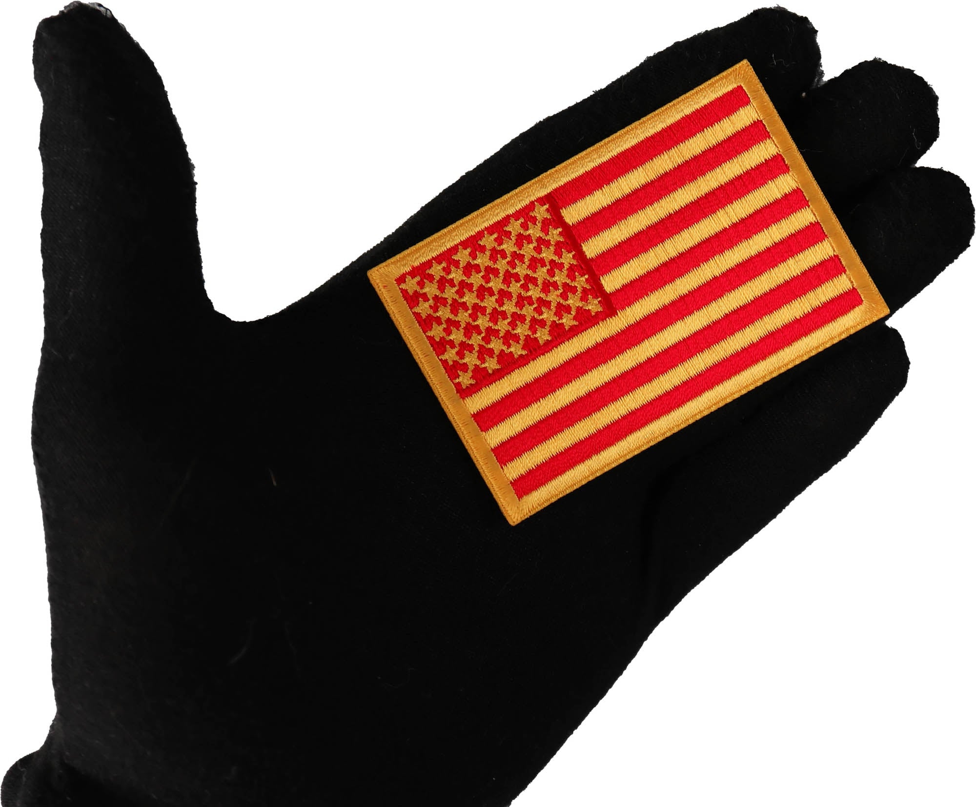 Red and Yellow US Flag Patch measures 3x2 inches and is Embroidered in Red / Yellow. The Small can be sewn on or ironed on to clothing. The Red and Yellow US Flag Patch features plastic iron on backing and clean laser cut embroidered borders.