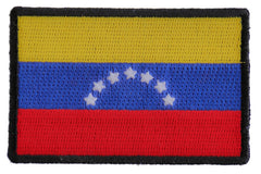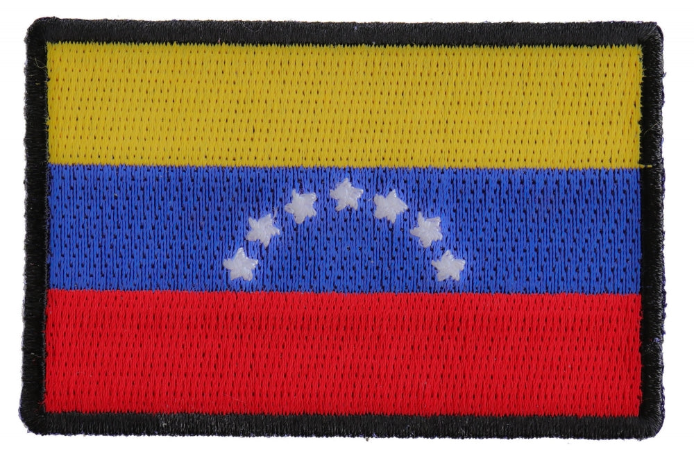 Venezuela Flag Patch measures 3x2 inches and is Embroidered in Black / Yellow / Blue / Red / White. The Small Patch can be sewn on or ironed on to clothing such as Denim or Leather Jackets, Vests, Hats, Back Packs, Shirts. Features plastic backing and embroidered die cut borders.