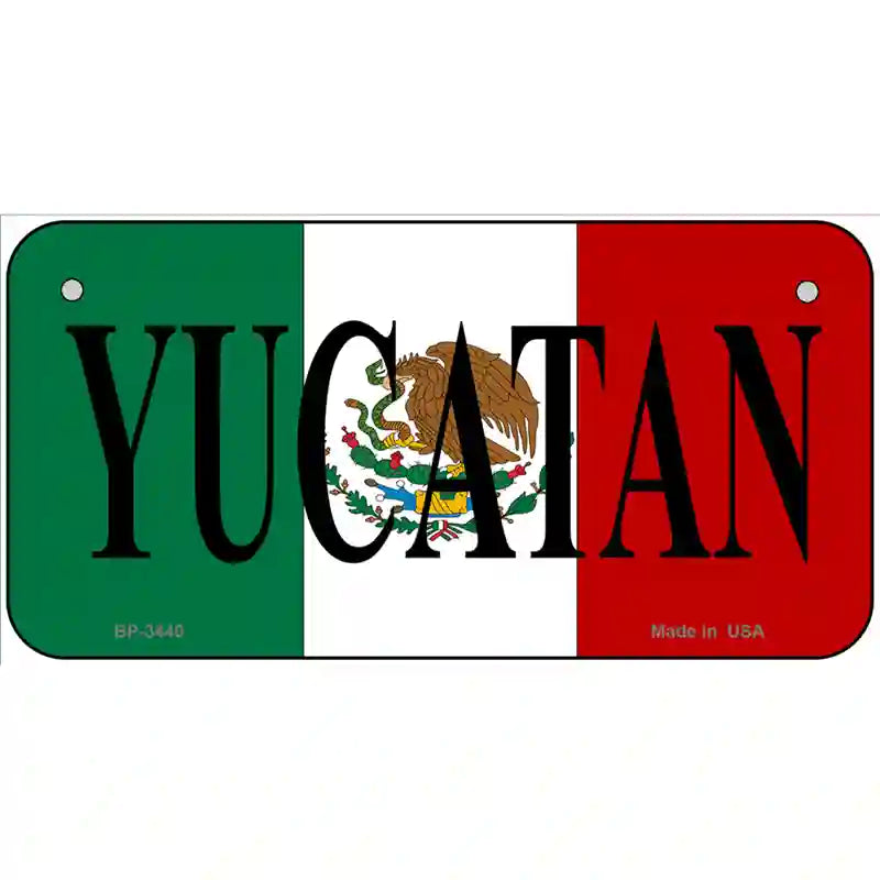 Yucatan on Mexico Flag Metal Novelty License Plate. Offering our unique license plate designs in a 12" Standard Automotive License Plate, 7" Motorcycle/ATV Plate, 6" Bike Plate, 4" Miniature License Plate and 24" large license plate garage sign. The 12" x 6" License Plate is made out of a .032 grade aluminum and the other sizes are made out of a .025 grade aluminum, which make them lightweight and durable. All license plates will have pre-drilled holes making these decorative license plates easy to display. Choose between the sizes offered or add all to your cart to show off your design in different ways. These items are proudly made here in the USA. Check out our other different sizes with the same artwork on them in our Key Chains, Rectangle Magnets, Dog Tag Necklaces, and Hat Pins.